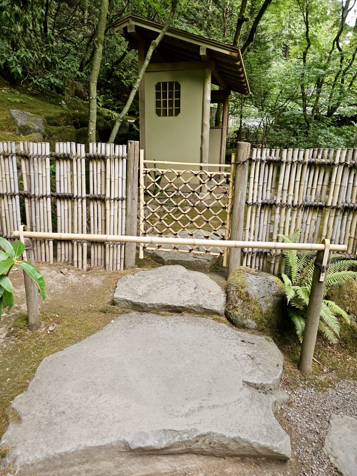 Alternative Text: A simple tea house structure sits behind a bamboo fence in the Portland Japanese Garden, with stone steps leading up through a quiet corner of the forest.