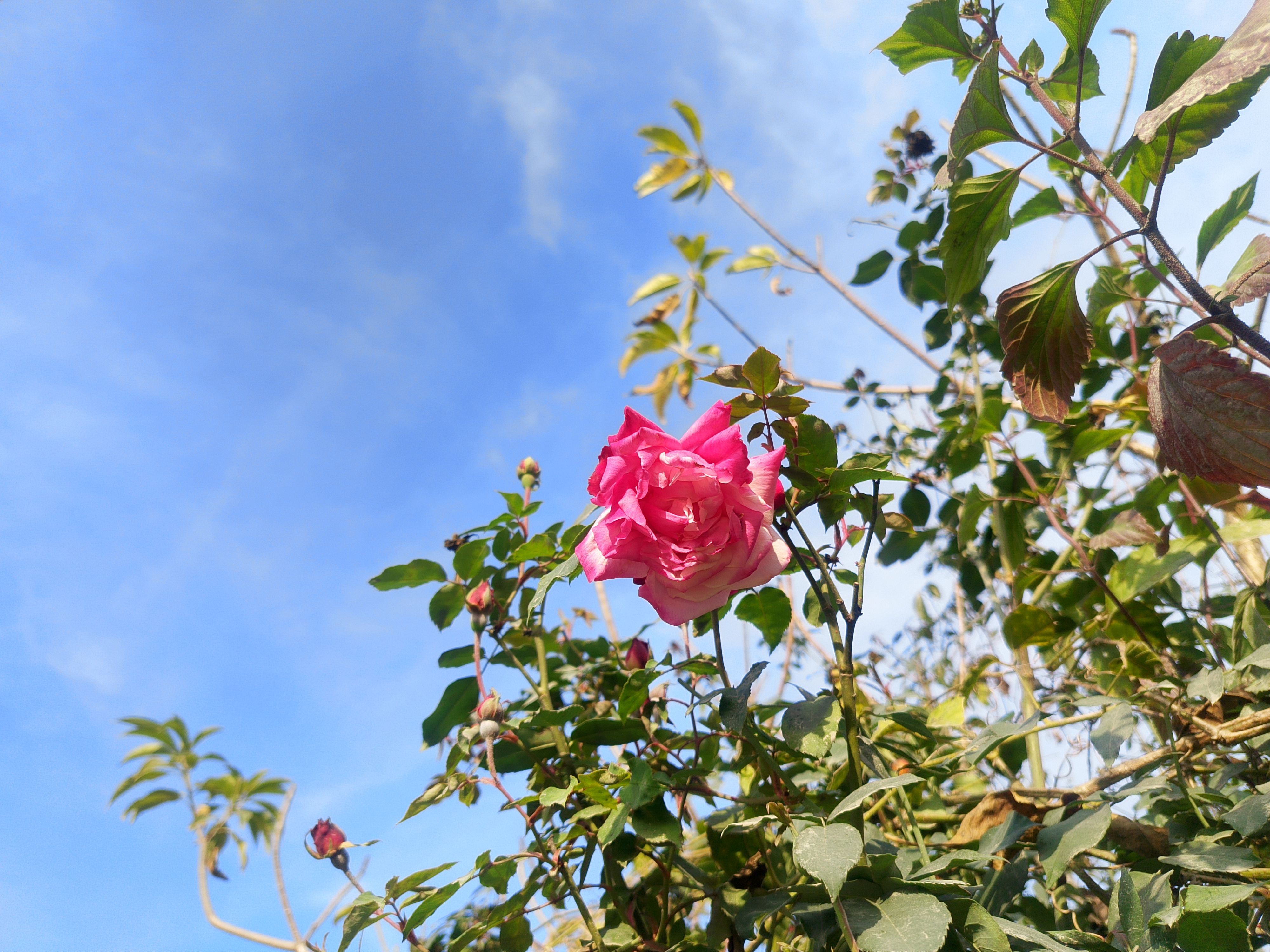 Alternative Text: A single pink rose blooms amidst green leaves, under a bright blue sky with soft clouds