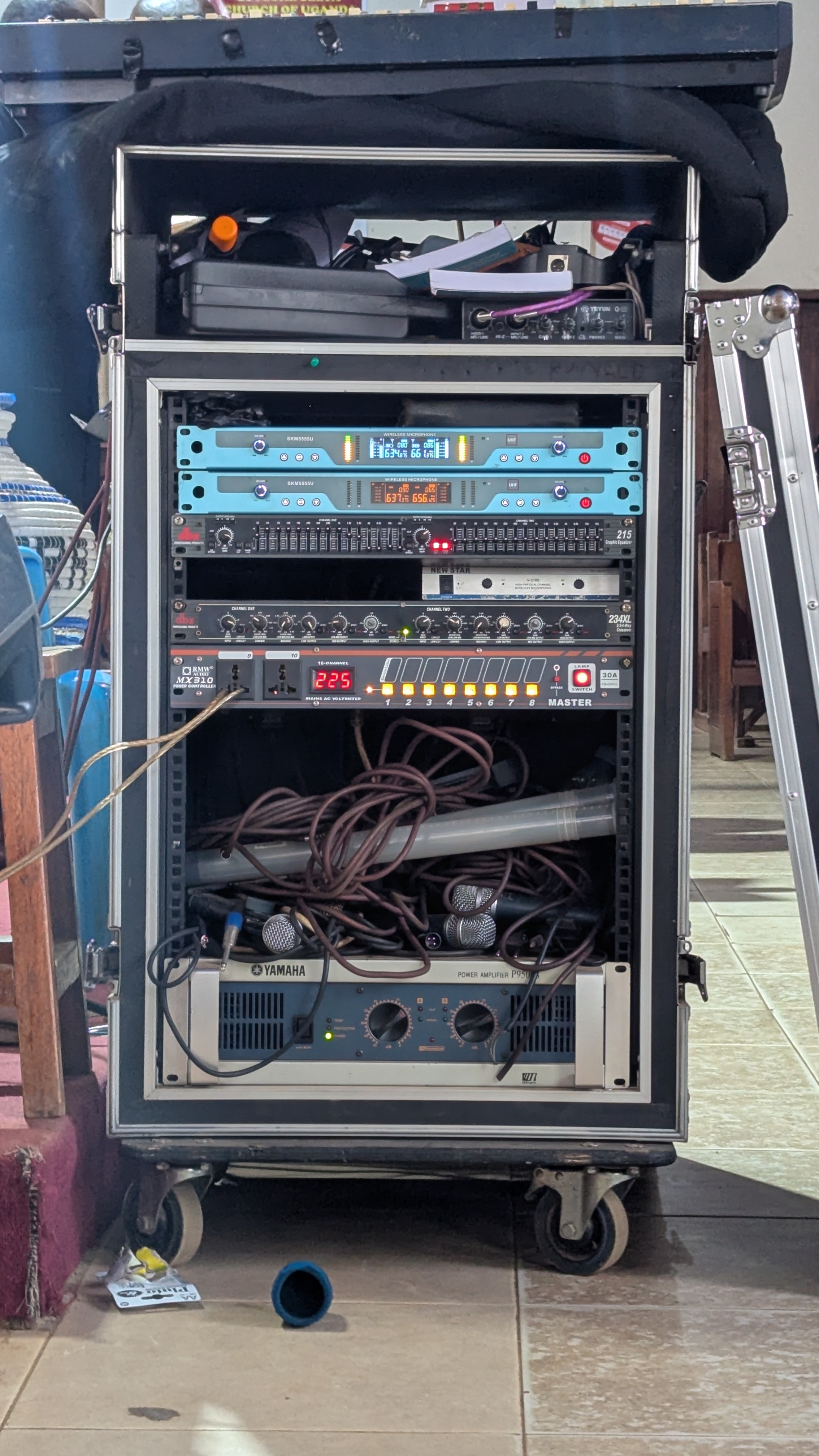Alternative Text: Audio karaoke system with some visible wires and microphones