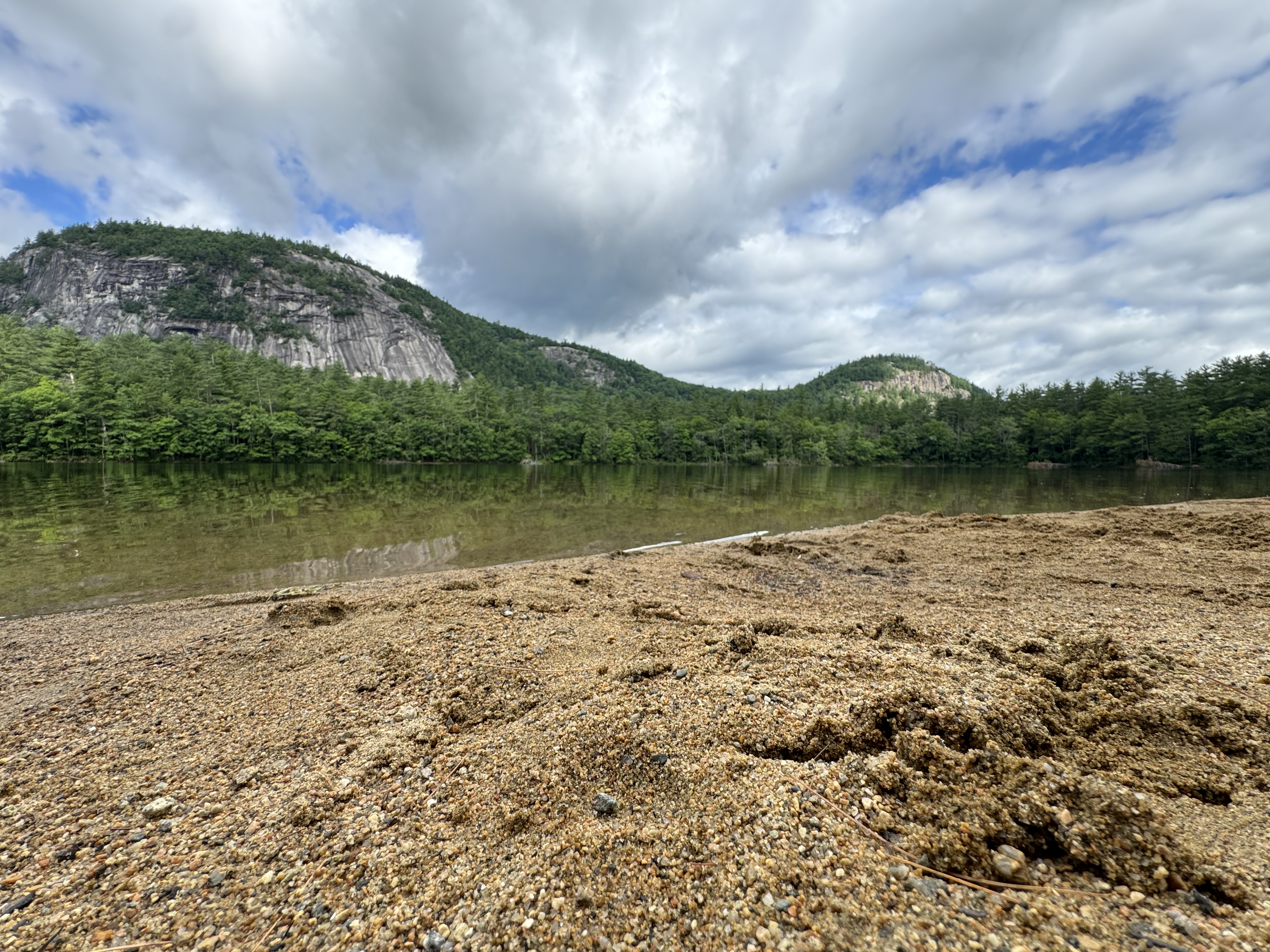 Alternative Text: A wet, sandy beach with some footprints in the foreground with Cathedral Ledge and White Horse Ledge are visible in the distance over Echo Lake in North Conway, New Hampshire.