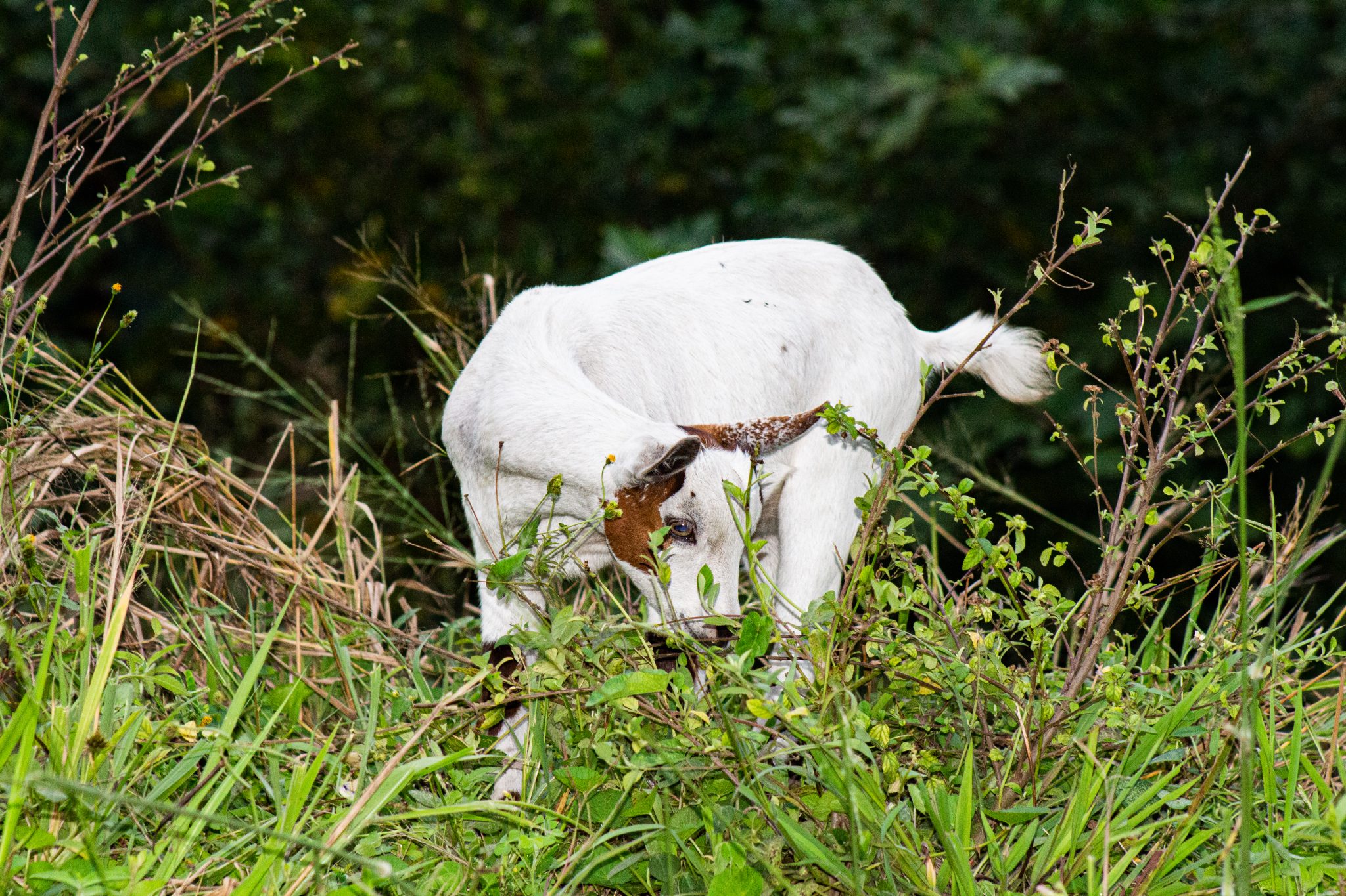 Alternative Text: A white goat with a brown patch on its head is grazing in a lush green field filled with tall grass and scattered plants.