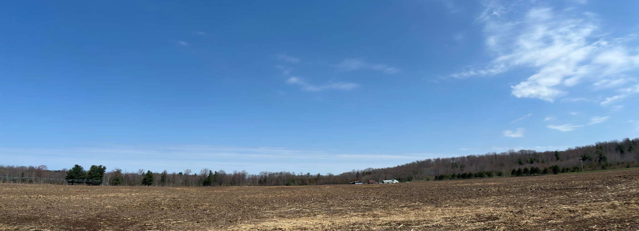 Alternative Text: Open field recently turned over and fertilized for the spring planting. There’s a farmstead in the distance on the other side of the field.