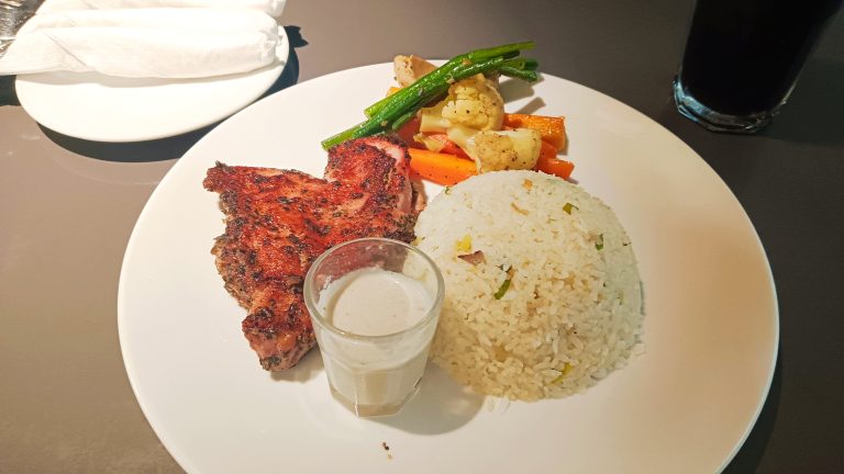 Alternative Text: A delicious-looking meal is presented on a white circular plate. The plate contains a seared piece of meat, a serving of white rice, and a side of mixed vegetables including carrots, cauliflower, and green beans.