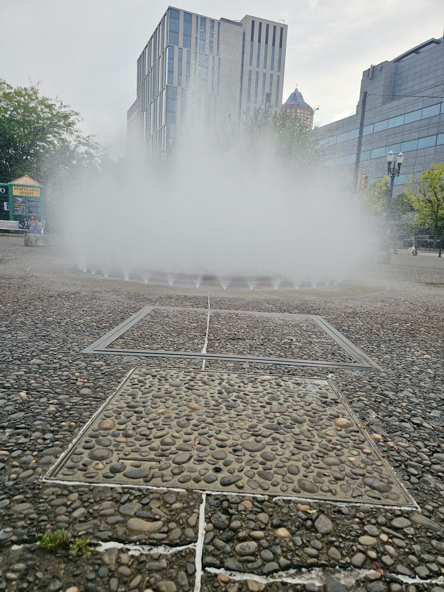 Alternative Text: A powerful fountain sprays water high in a public plaza, surrounded by smooth pebbles and featuring modern buildings in the background under a cloudy sky. Captured from Portland river front.