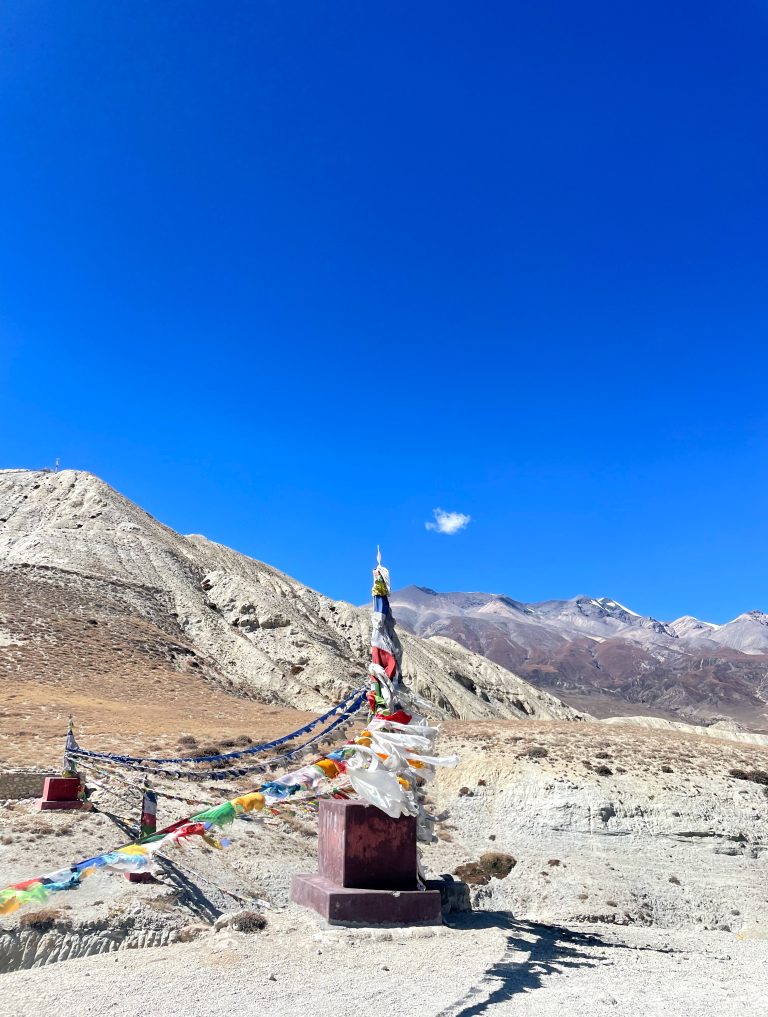 Alternative Text: A rocky, barren landscape with a red stupa wrapped in colorful prayer flags under a clear blue sky.