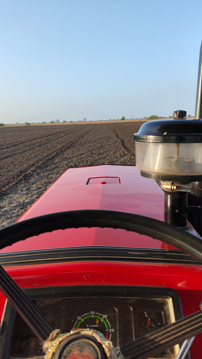 Alternative Text: A view from the driver’s seat of a red tractor overlooking a plowed field.