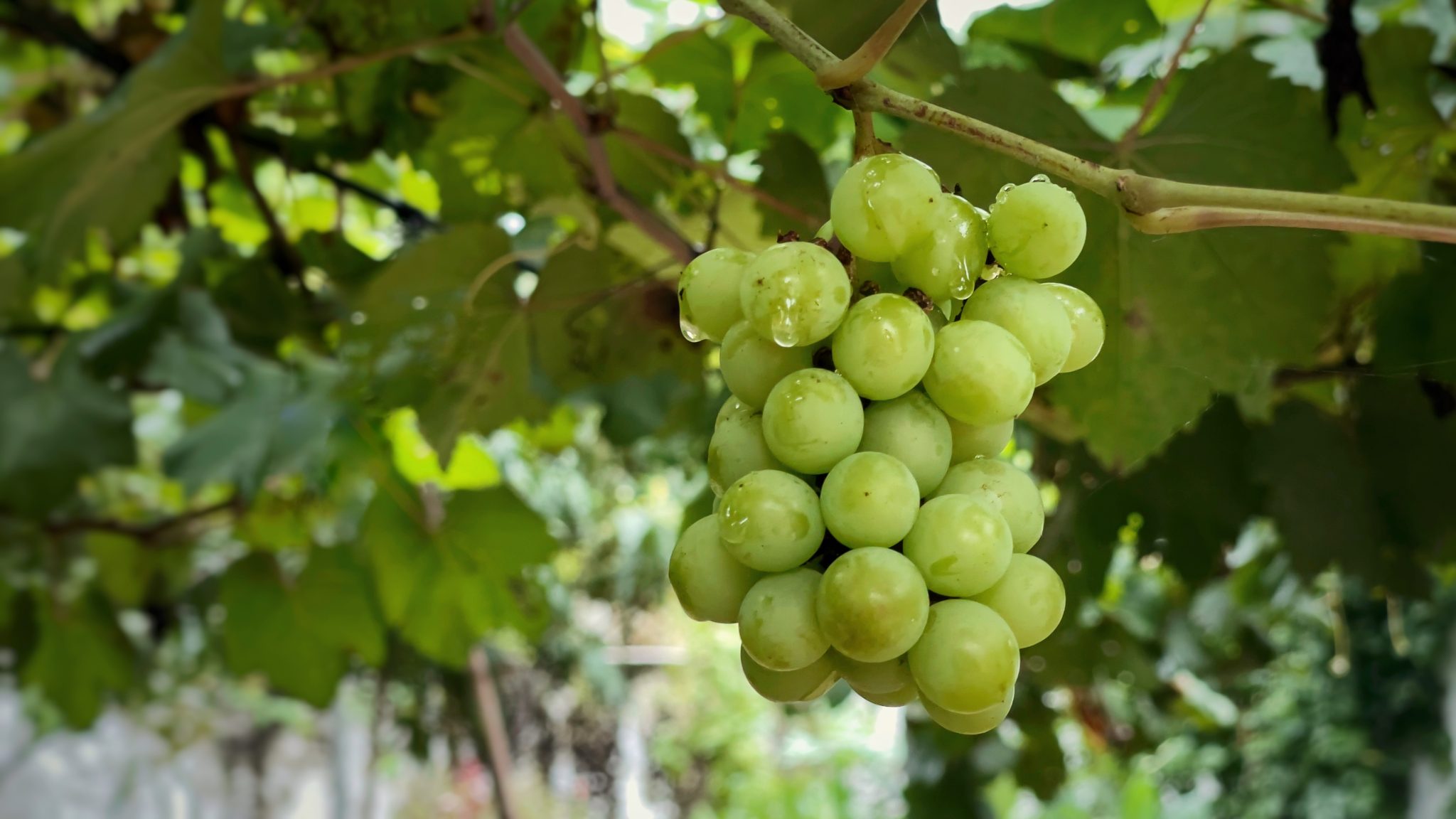 Alternative Text: A close-up image of a cluster of green grapes hanging from a vine, surrounded by lush green leaves.
