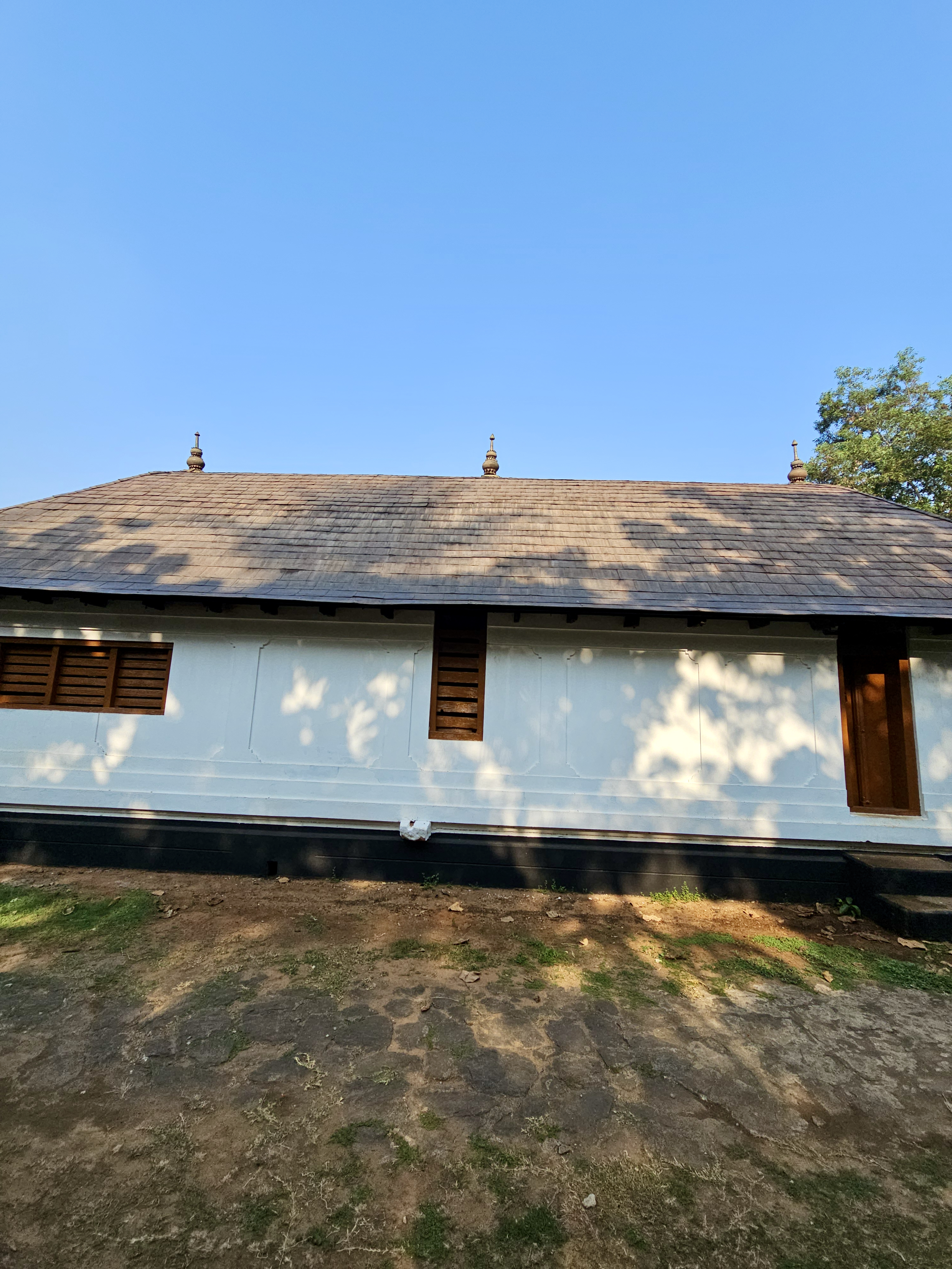 Alternative Text: A traditional Kerala style temple building with a sloping metal tiled roof and white walls under a clear blue sky, featuring wooden windows and a door. Captured at Niramkaitha Kotta Temple, Vallikunnu North, Malappuram.