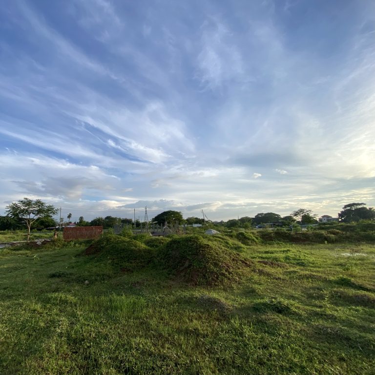 Alternative Text: A wide landscape showing a grassy field with two small mounds covered in greenery.