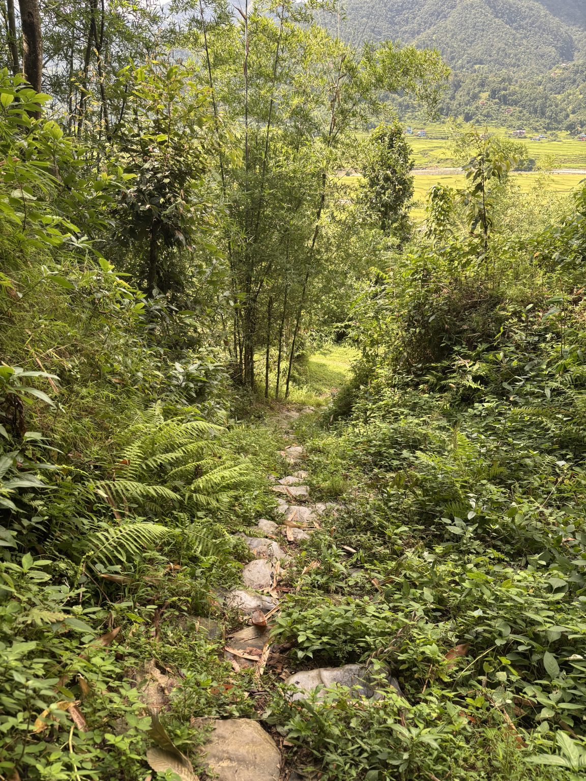 Alternative Text: A winding stone path descends through lush greenery with bamboo and ferns.