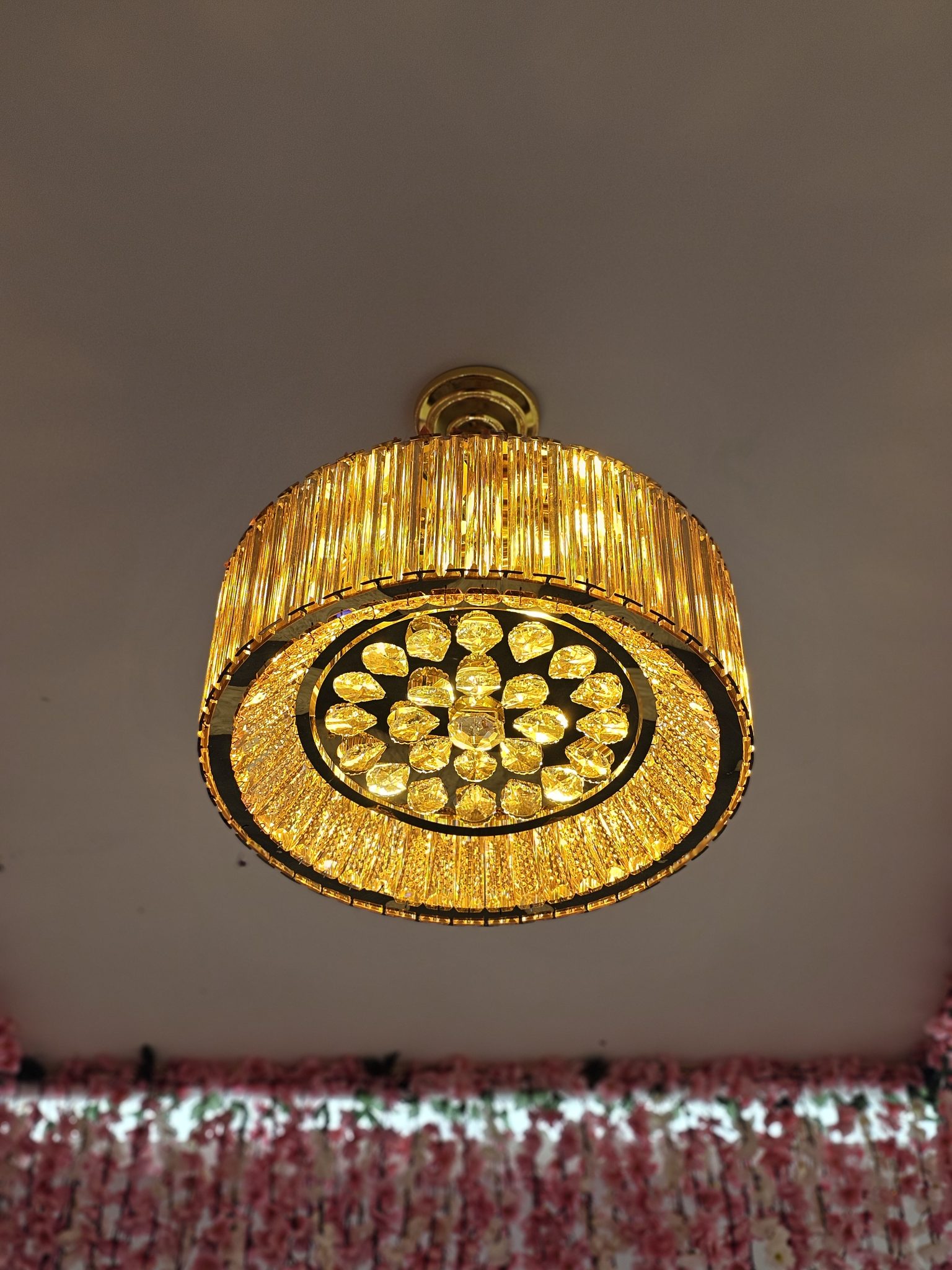 Alternative Text: A round, gold-toned crystal chandelier suspended from the ceiling. It emits a warm light through rows of vertical crystals around the side and a pattern of circular crystal elements on the bottom.