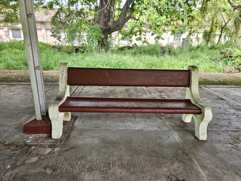 Alternative Text: A cement bench, painted in brown and cream, sits under a canopy on the old railway platform at Cochin Harbour Terminus, offering a peaceful and nostalgic view from Kochi.