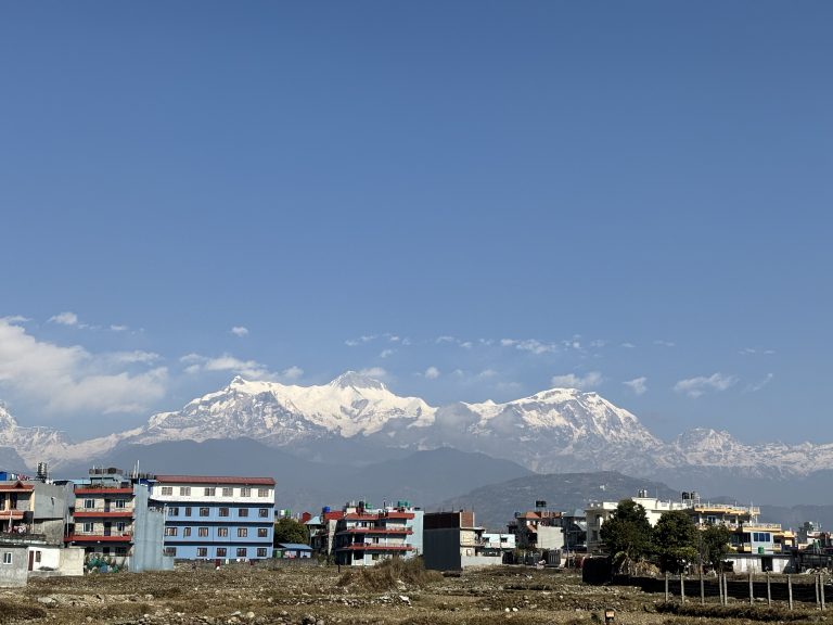 Alternative Text: A scenic view of snow-capped mountains under a bright blue sky, with a line of colorful buildings in the foreground.