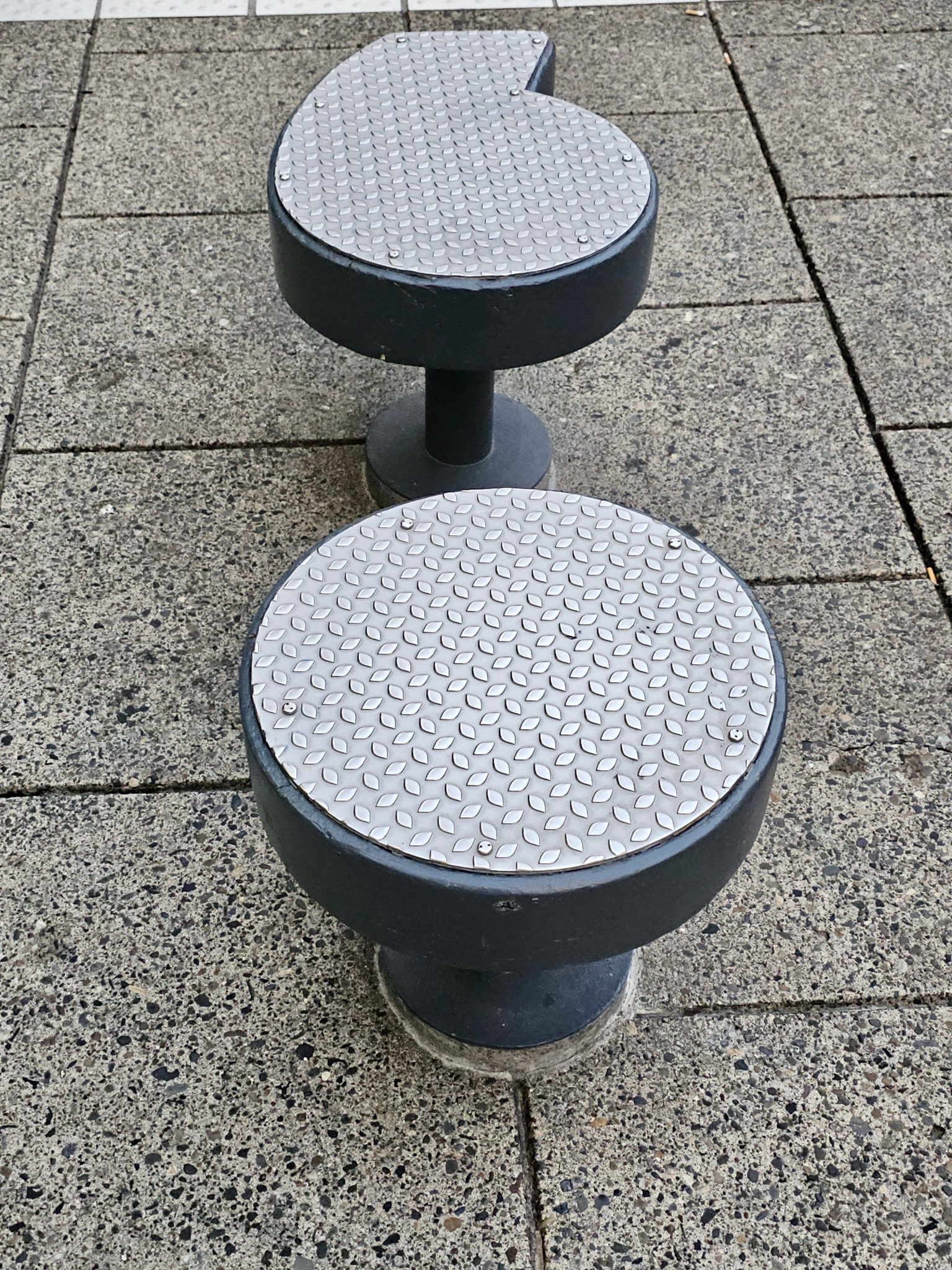 Alternative Text: Two dark gray, metal-topped stools or seating elements with a textured, diamond plate pattern on their surfaces, set on a concrete ground. Captured from Providence Park, Portland.