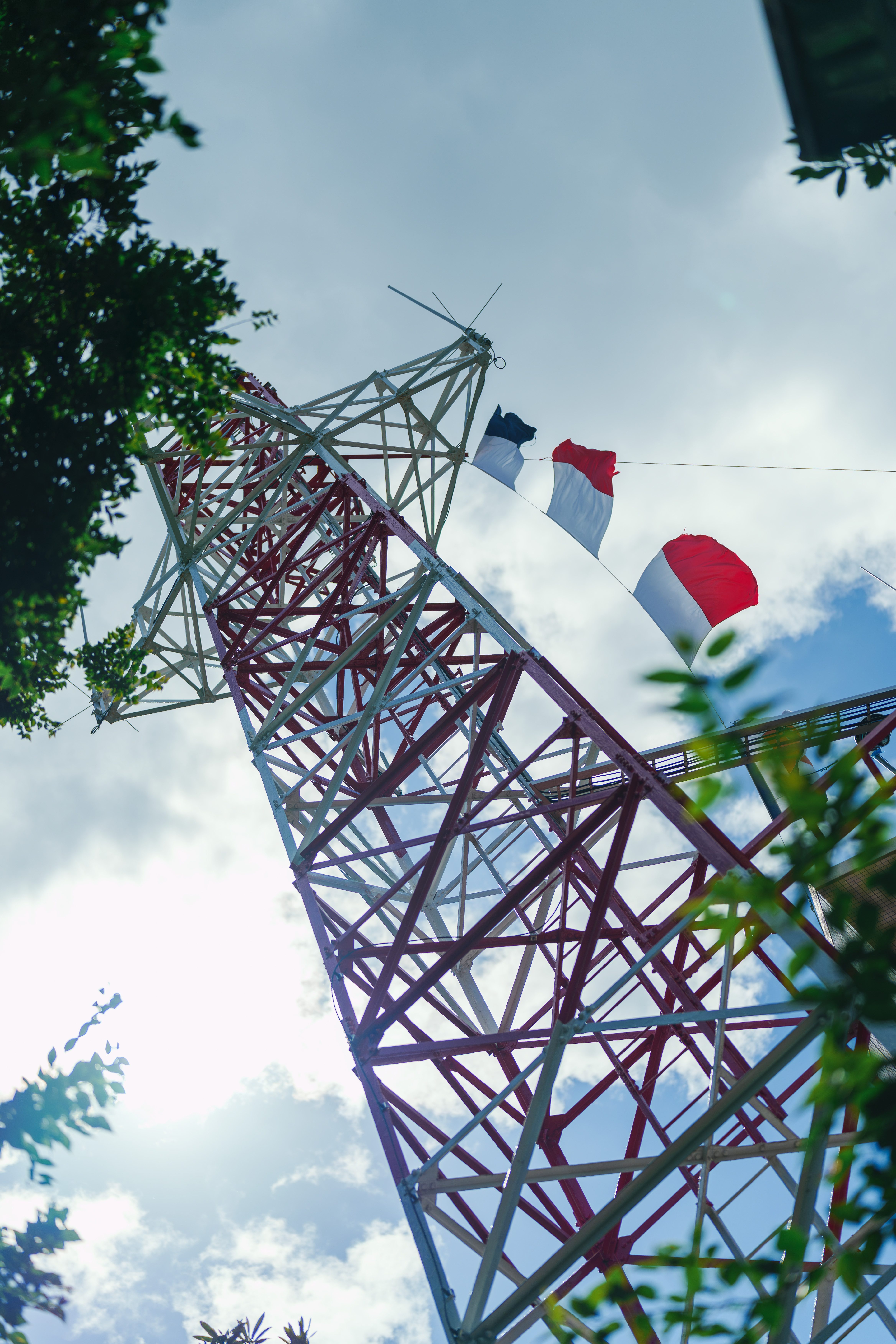 Alternative Text: A dramatic low-angle shot looking up at a towering red and white steel lattice structure, possibly a transmission tower or radio mast. The geometric metal framework is framed naturally by green foliage in the foreground. At the top, wind indicators flutter against a bright blue sky scattered with soft white clouds.