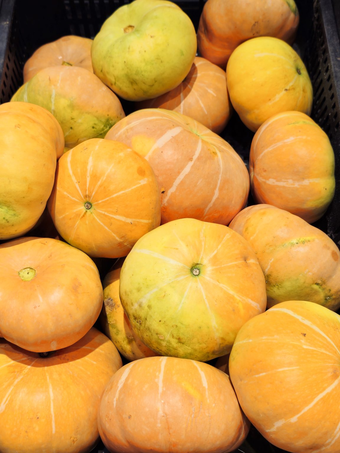Alternative Text: Round yellow pumpkins are arranged neatly in a crate at a hypermarket in Kozhikode, Kerala. Their smooth skin and natural color patterns make the display look bright and inviting.