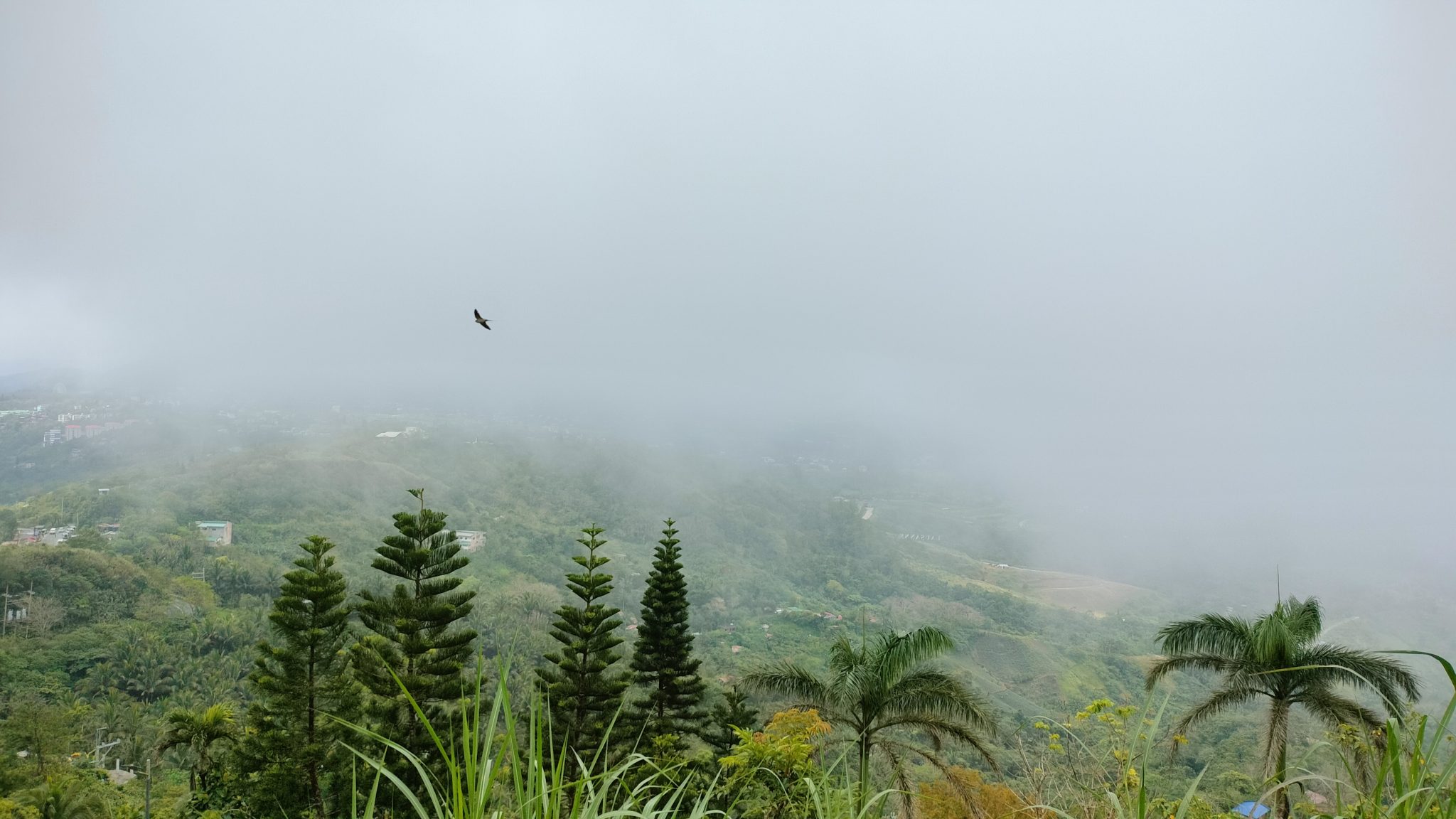 Alternative Text: Misty hills with conifers, palms, and a lone bird fading into dense clouds. A photo captured on hills of Tagatay city.
