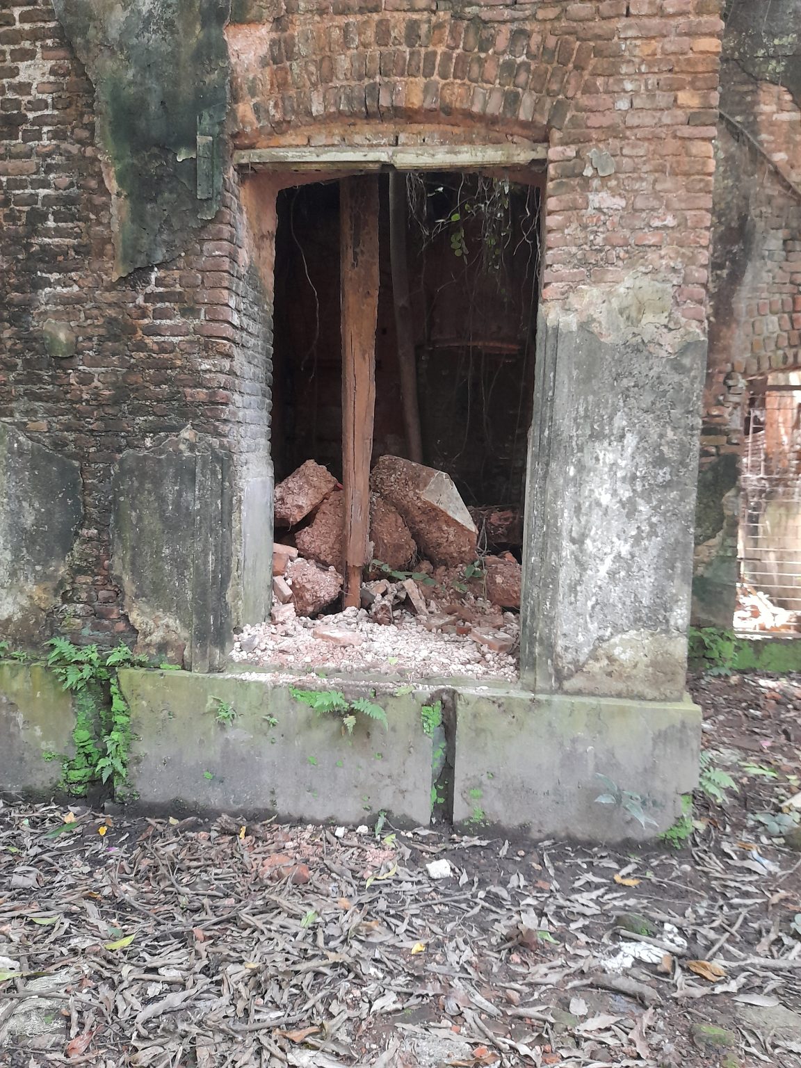 Alternative Text: A partially collapsed brick wall with an arched doorway reveals a pile of rubble inside.