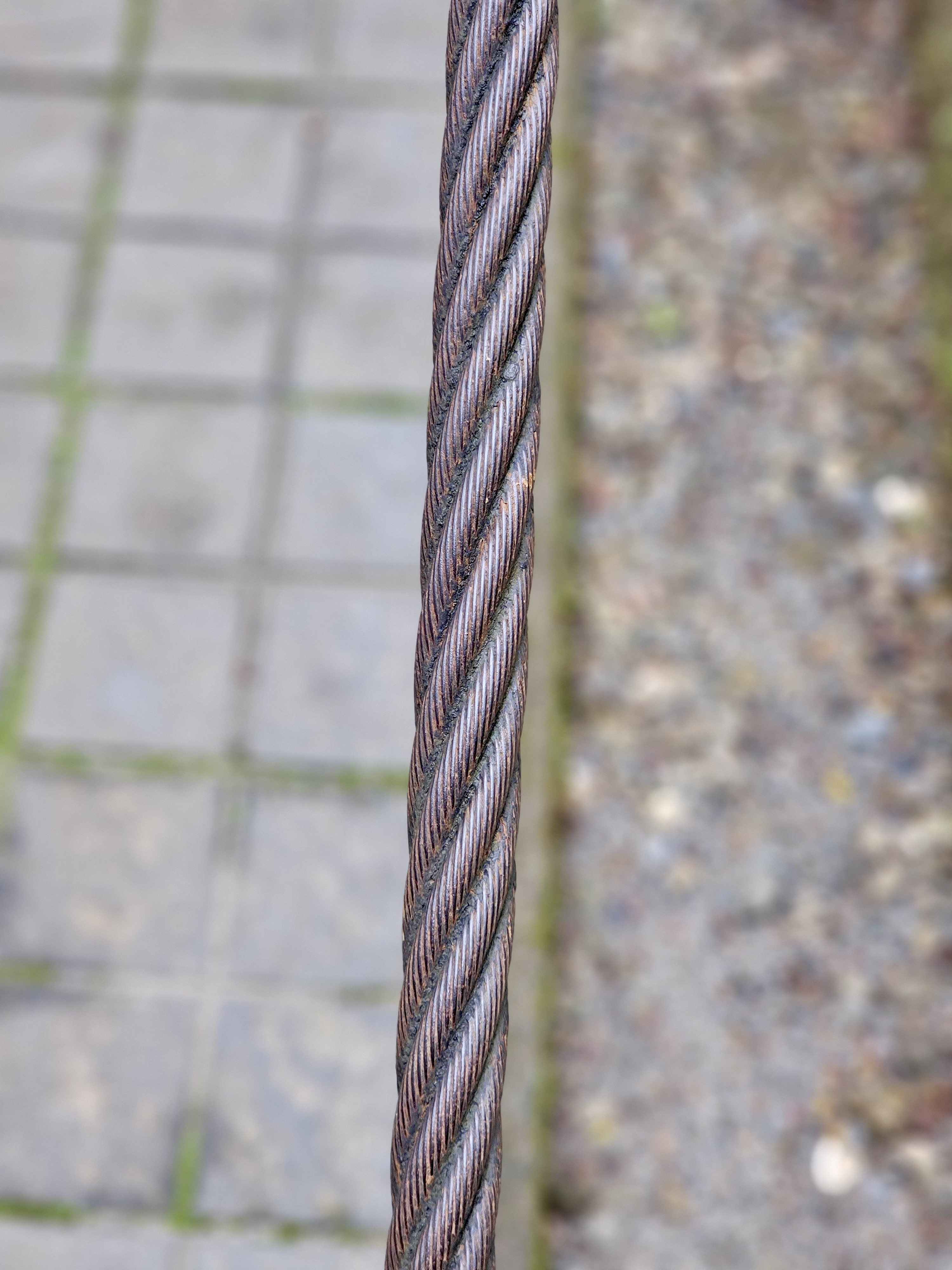 Alternative Text: A close-up photo of a thick, twisted steel cable used as a support rope, clicked near a trail path close to Thusharagiri Falls, Kozhikode, Kerala.