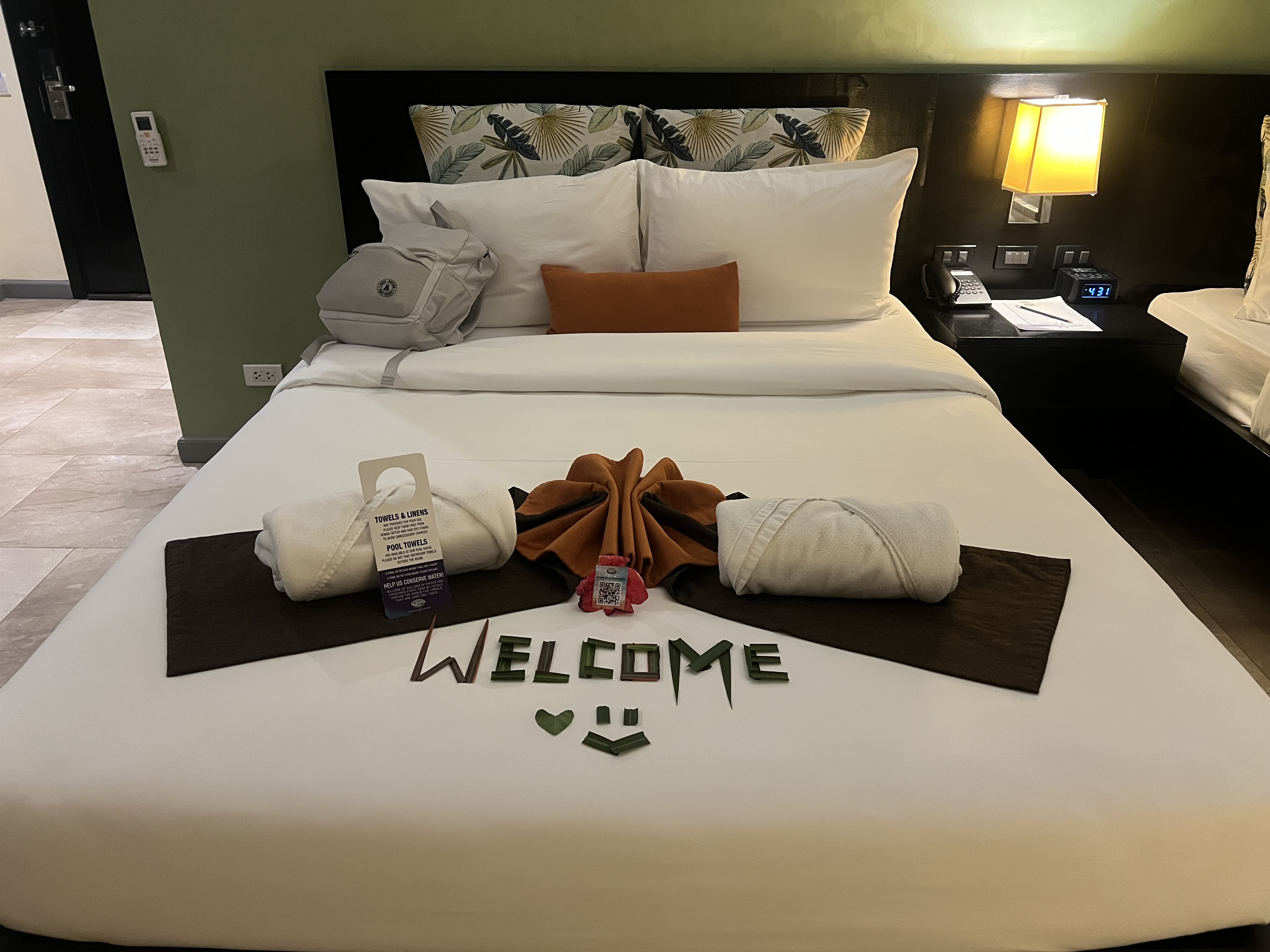 Alternative Text: A neatly arranged hotel room bed featuring a white bedspread and large pillows