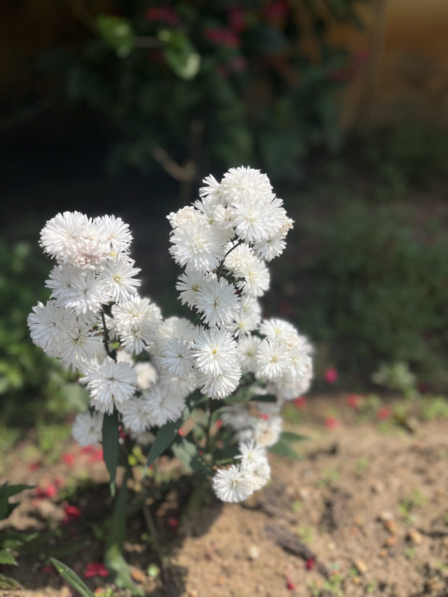 Alternative Text: White flowers on a bush against a blurred background