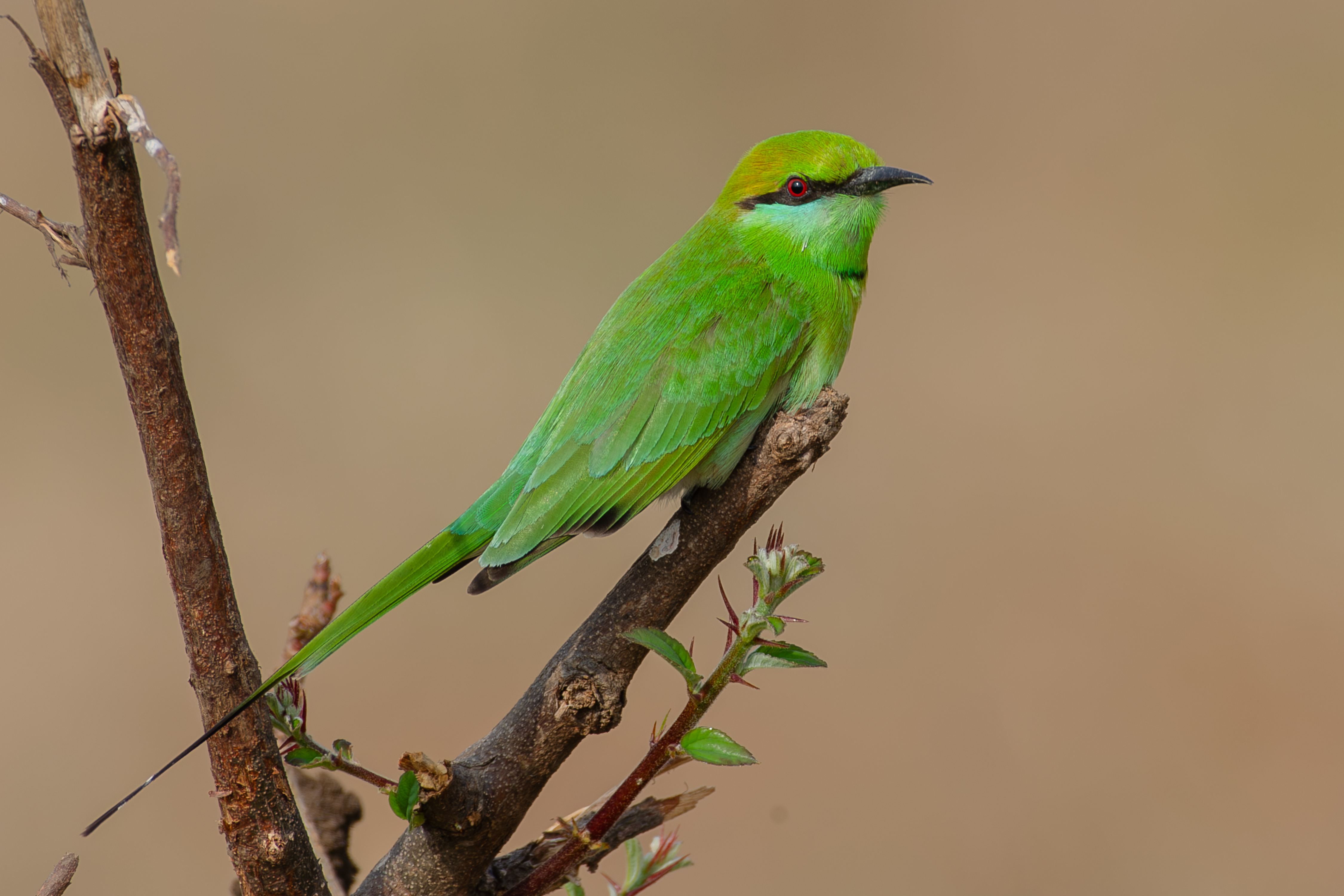 Alternative Text: A Green Bee-eater on a branch, with bright green feathers, a black eye-stripe, red eye, and long tail streamers.
