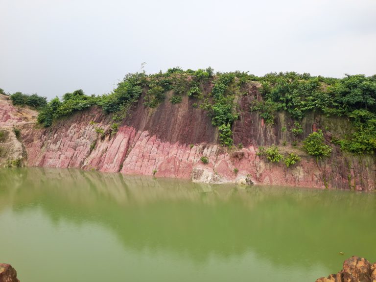 Alternative Text: A natural landscape featuring a steep, rocky cliff with reddish hues, partially covered in greenery, adjacent to a river.