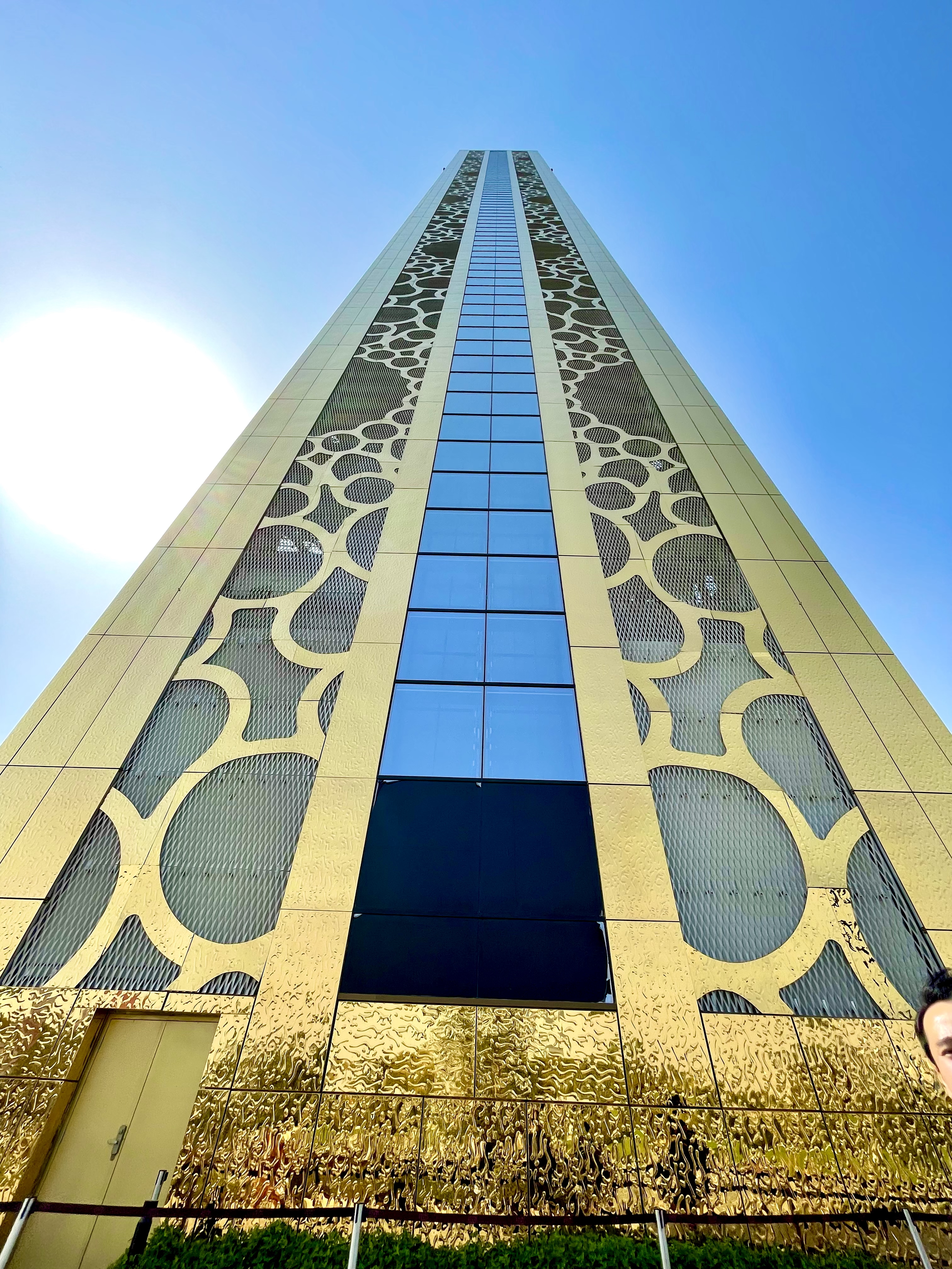 Alternative Text: A low-angle view of the Dubai Frame, a golden, modern structure with a large rectangular opening.