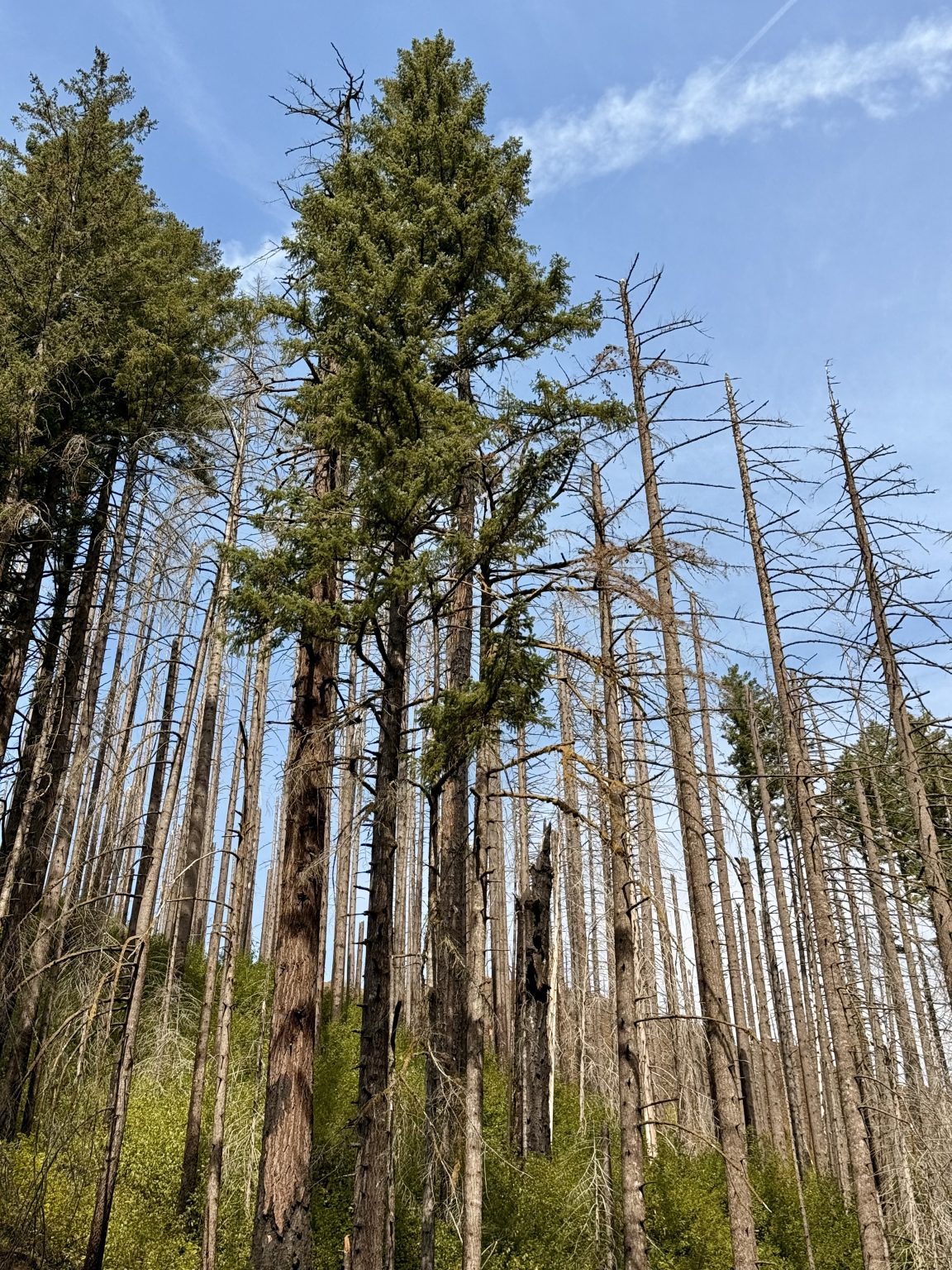 Alternative Text: A mix of tall, green, and burned trees standing closely together under a clear blue sky in the Columbia River Gorge National Scenic Area, Oregon, is a sign of recovery after a wildfire.