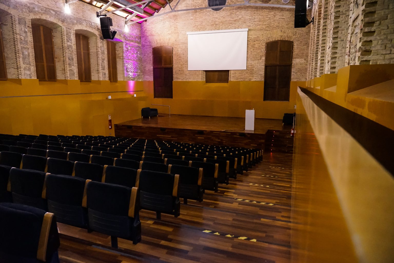 Alternative Text: An empty auditorium with rows of black chairs facing a stage. The stage has a white screen, a lectern, and a black chair. The walls are decorated with stone bricks and wooden panels, and there is ambient lighting with a pink hue on the left side.