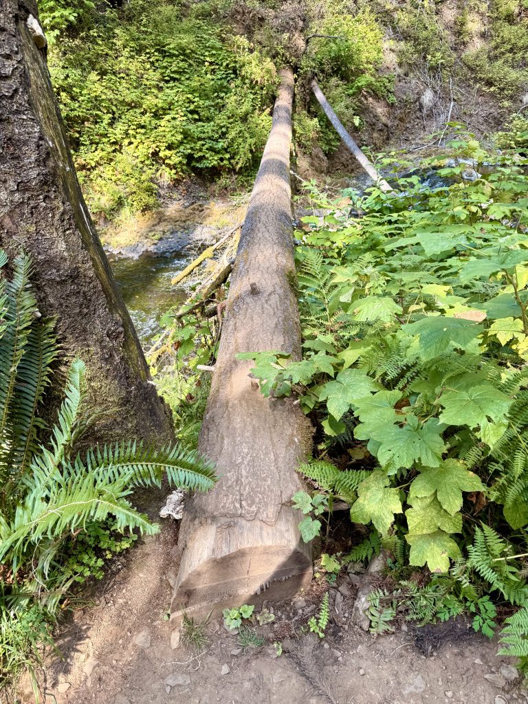 Alternative Text: A fallen tree forms a natural bridge over a stream, surrounded by bright green plants. Columbia River Gorge National Scenic Area, Oregon.