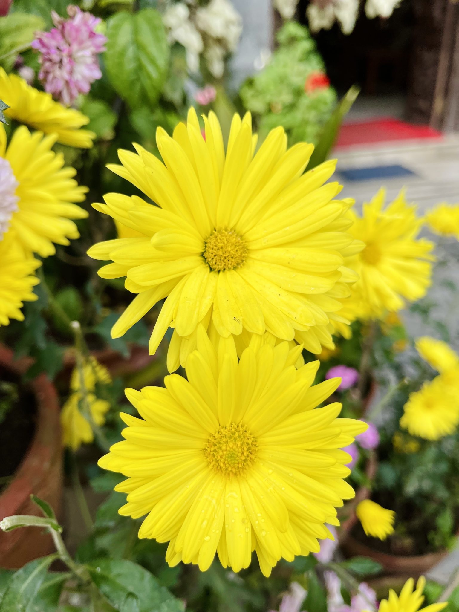 Alternative Text: A close-up of two bright yellow flowers with frilly petals.