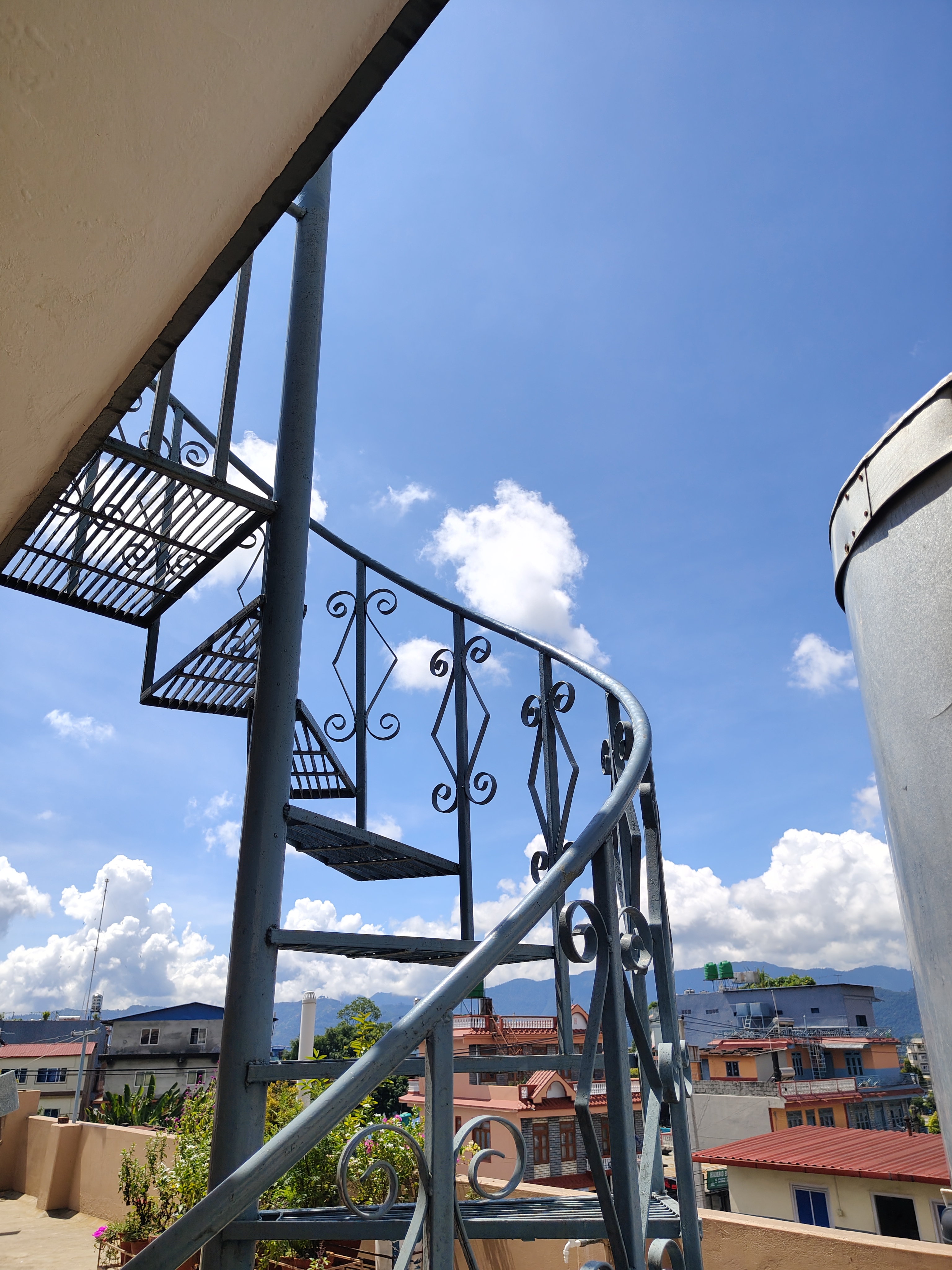 Alternative Text: A spiral staircase made of metal curves upward against a bright blue sky with fluffy white clouds