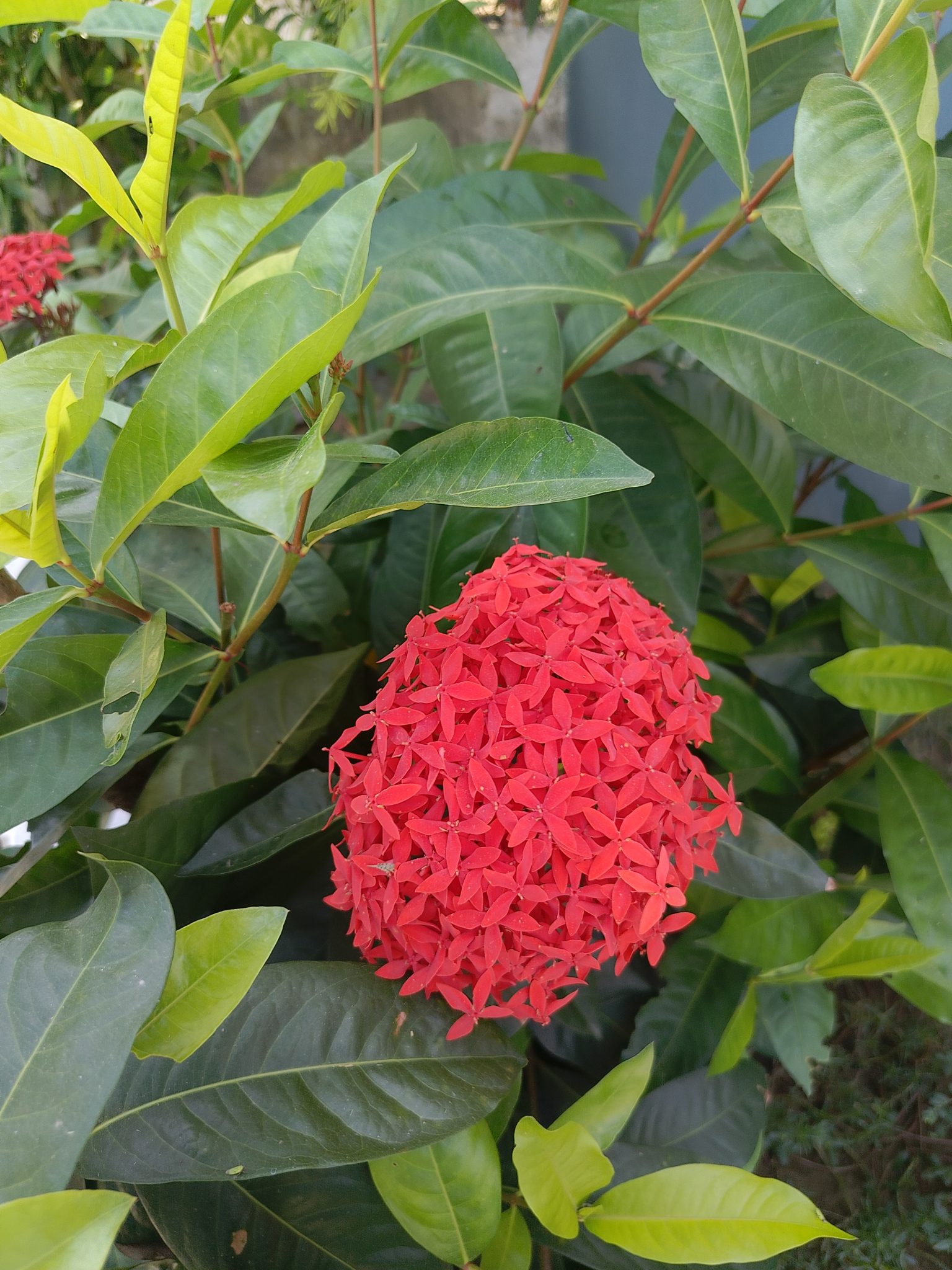 Alternative Text: A vibrant cluster of red flowers surrounded by green leaves, showcasing a dense arrangement of star-shaped blossoms.