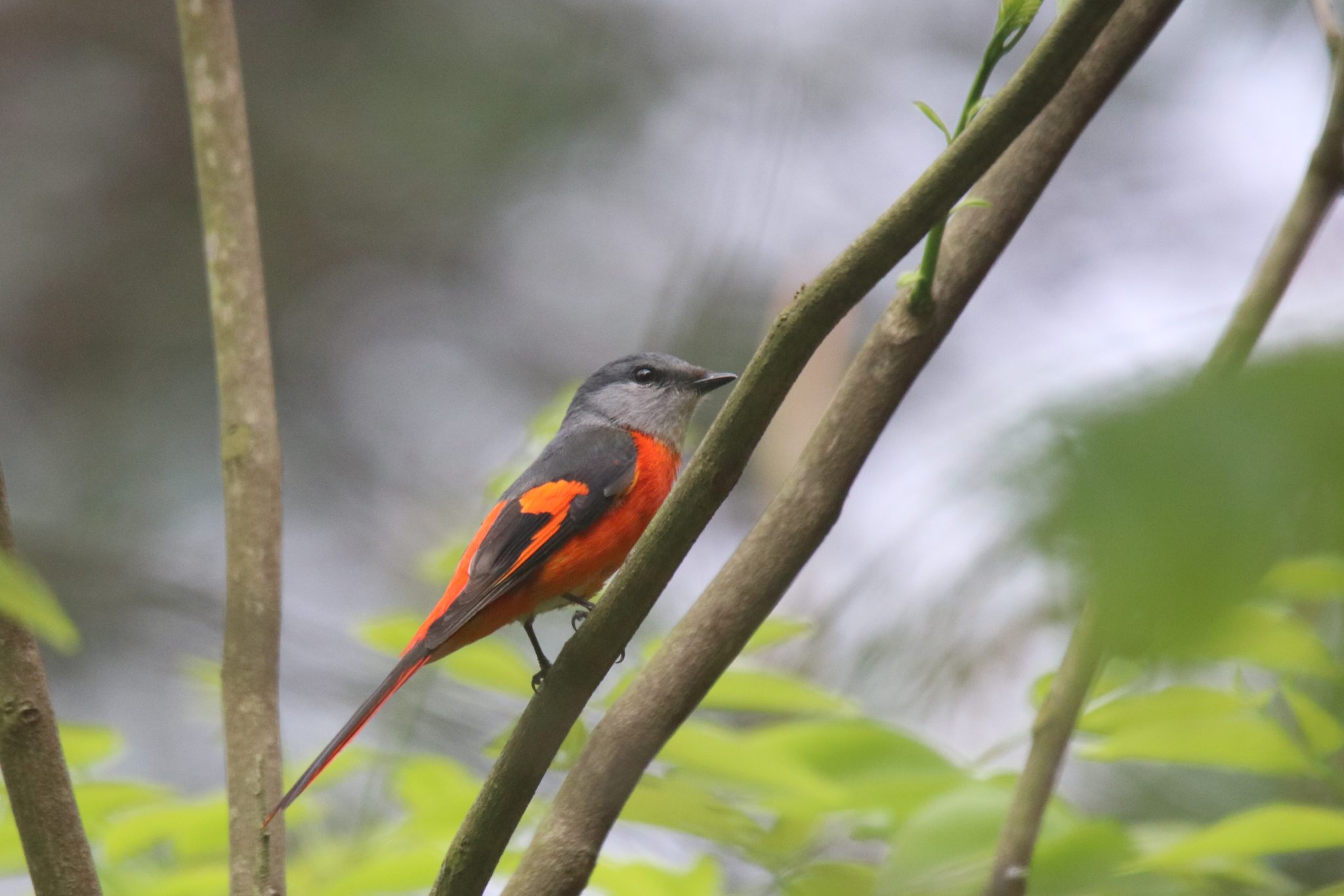Alternative Text: A male Grey-chinned Minivet perched on a branch.