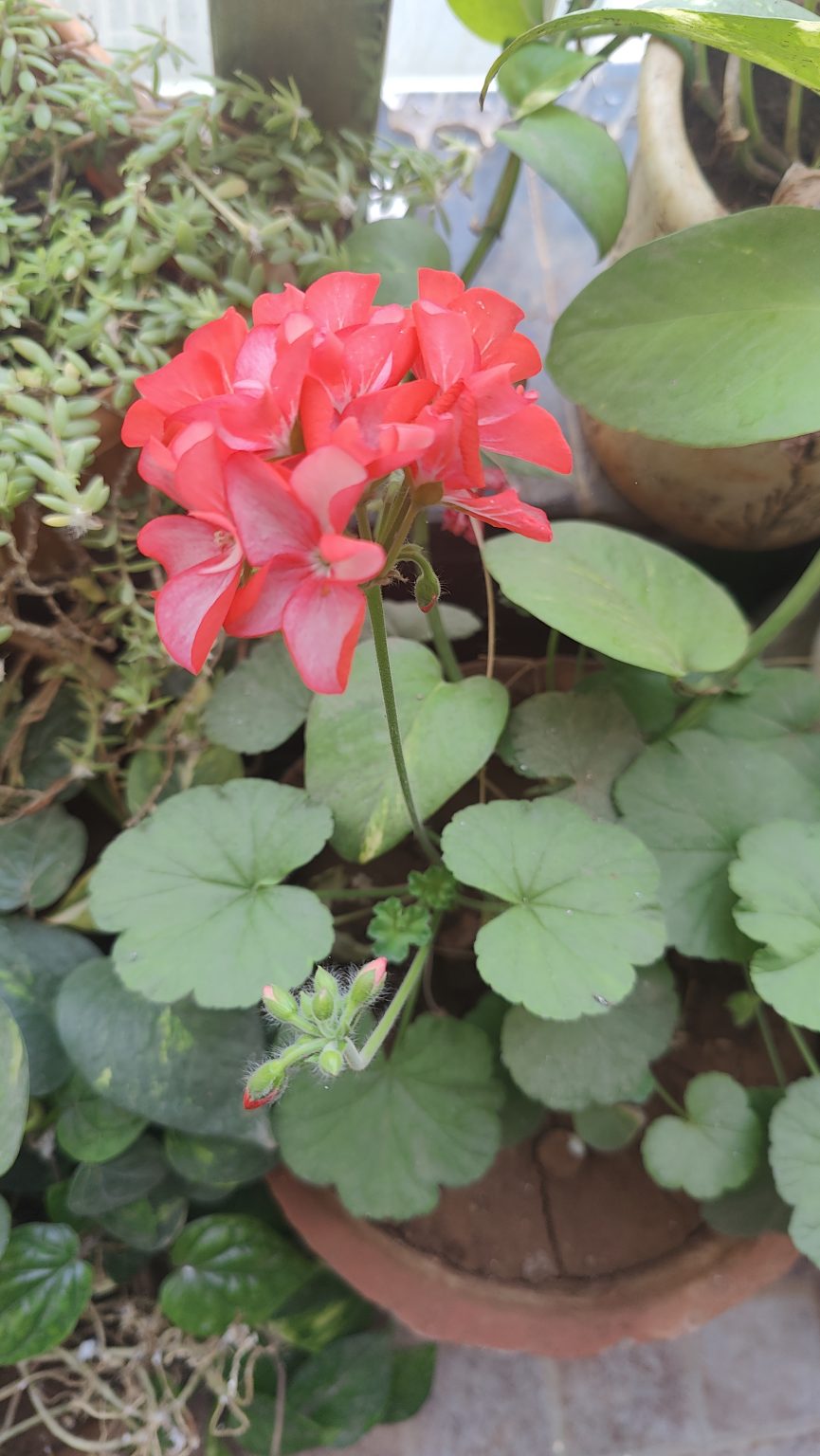 Alternative Text: A vibrant red geranium flower in full bloom, with lush green leaves, in a terracotta pot, indicative of a well-tended garden.