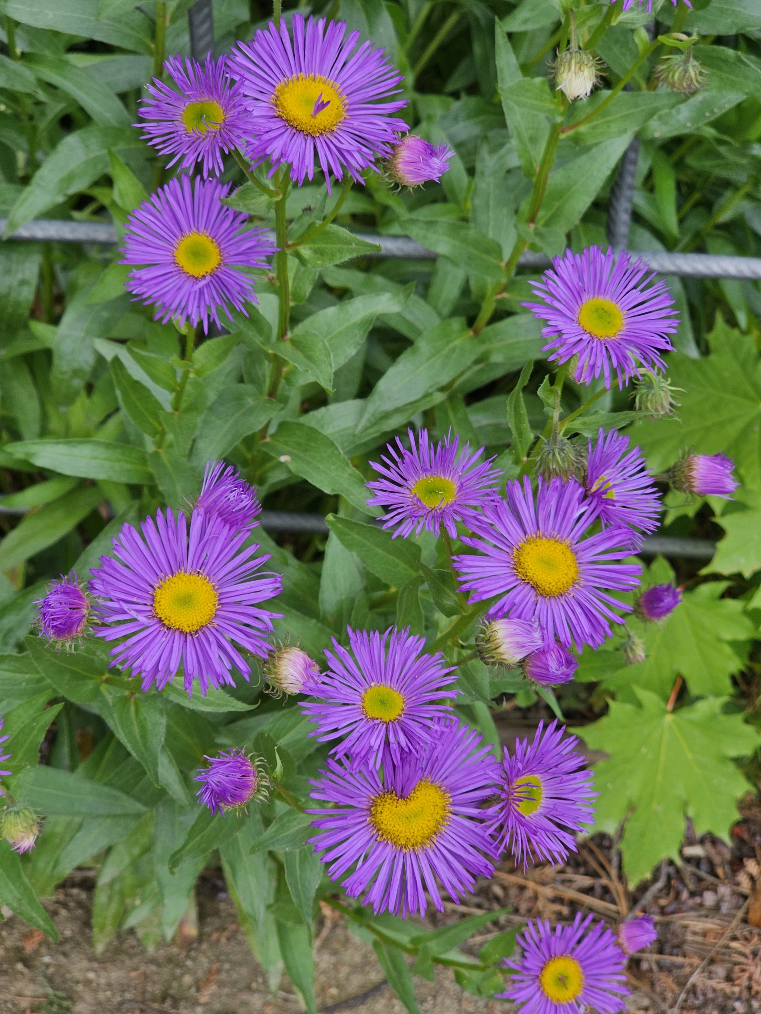 Alternative Text: A cluster of Erigeron Dunkelste Aller flowers, also known as Alpine Aster, with vibrant purple petals and yellow centers, surrounded by green leaves. Some flowers are in full bloom, while others are still buds, from the garden of Vyšehrad Castle in Prague.