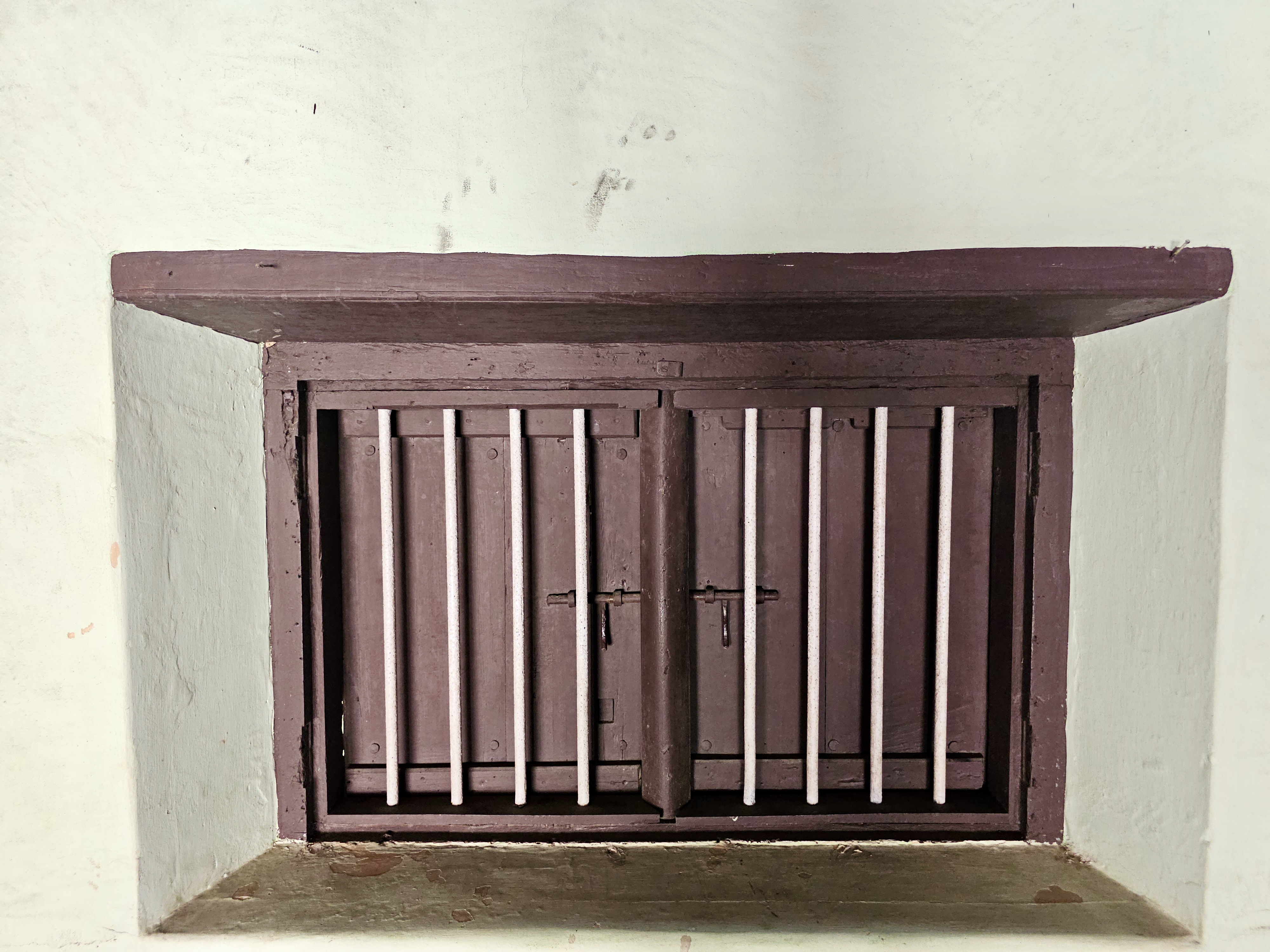 Alternative Text: A tiny wooden window secured with vertical iron bars and a latch, set within a thick wall, seen at Hill Palace, Thrippunithura, Kerala.