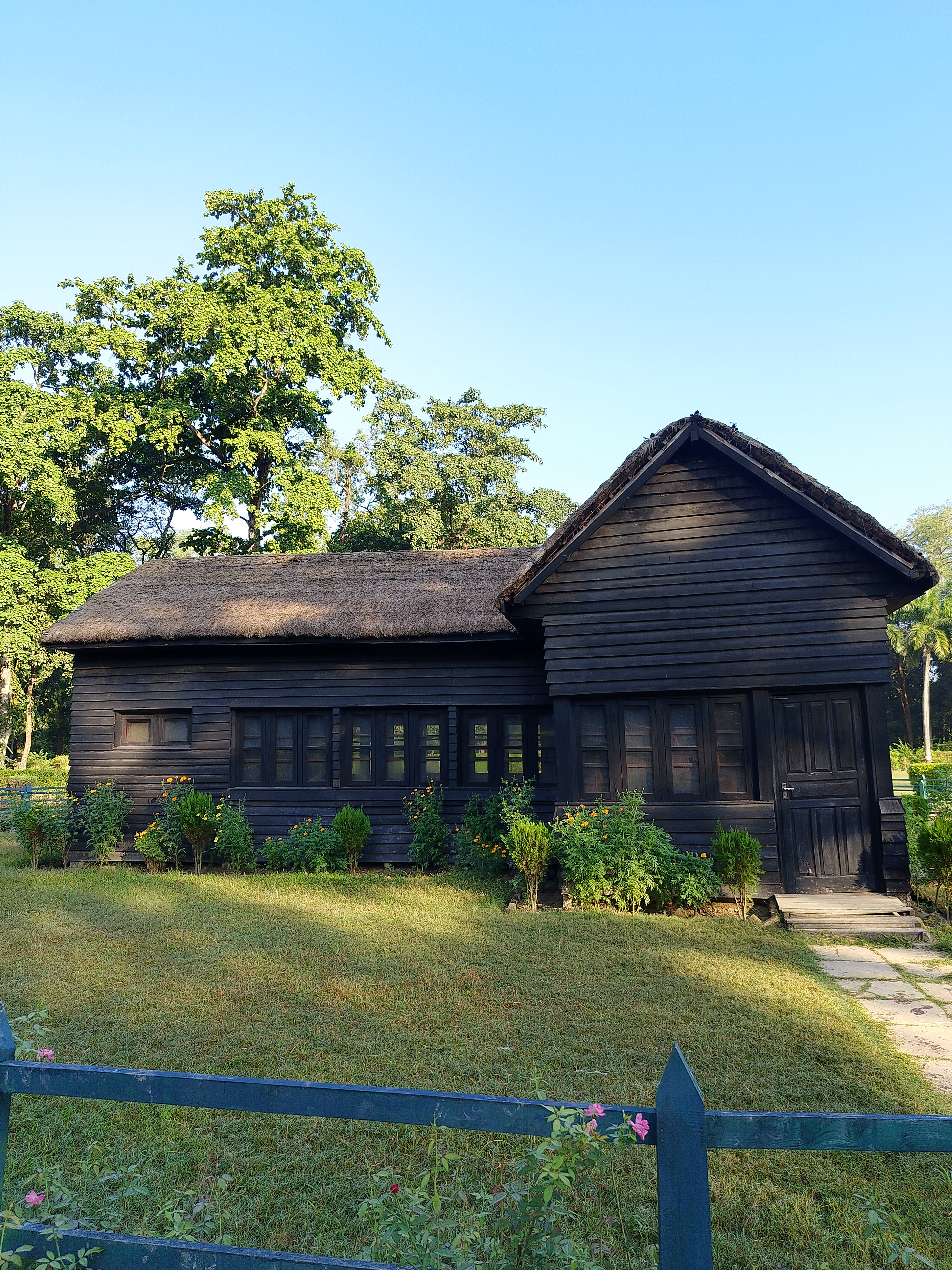 Alternative Text: A small, dark wooden house with a thatched roof stands in a grassy yard surrounded by green plants and trees under a clear blue sky. Sunlight highlights parts of the roof and lawn, and a low fence with a few flowers runs along the foreground.