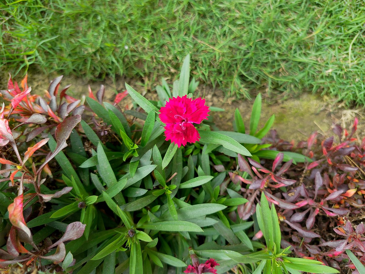 Alternative Text: A vibrant pink flower blooms amidst green foliage, surrounded by reddish-leaved plants.