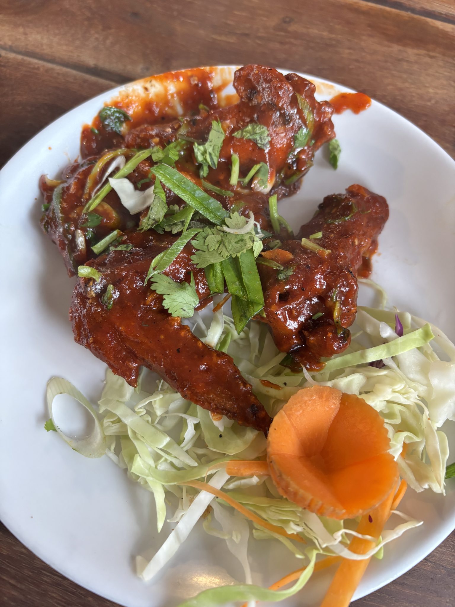 Alternative Text: A white plate holds several pieces of chicken wings coated in a rich, red sauce, garnished with chopped green onions and fresh cilantro.