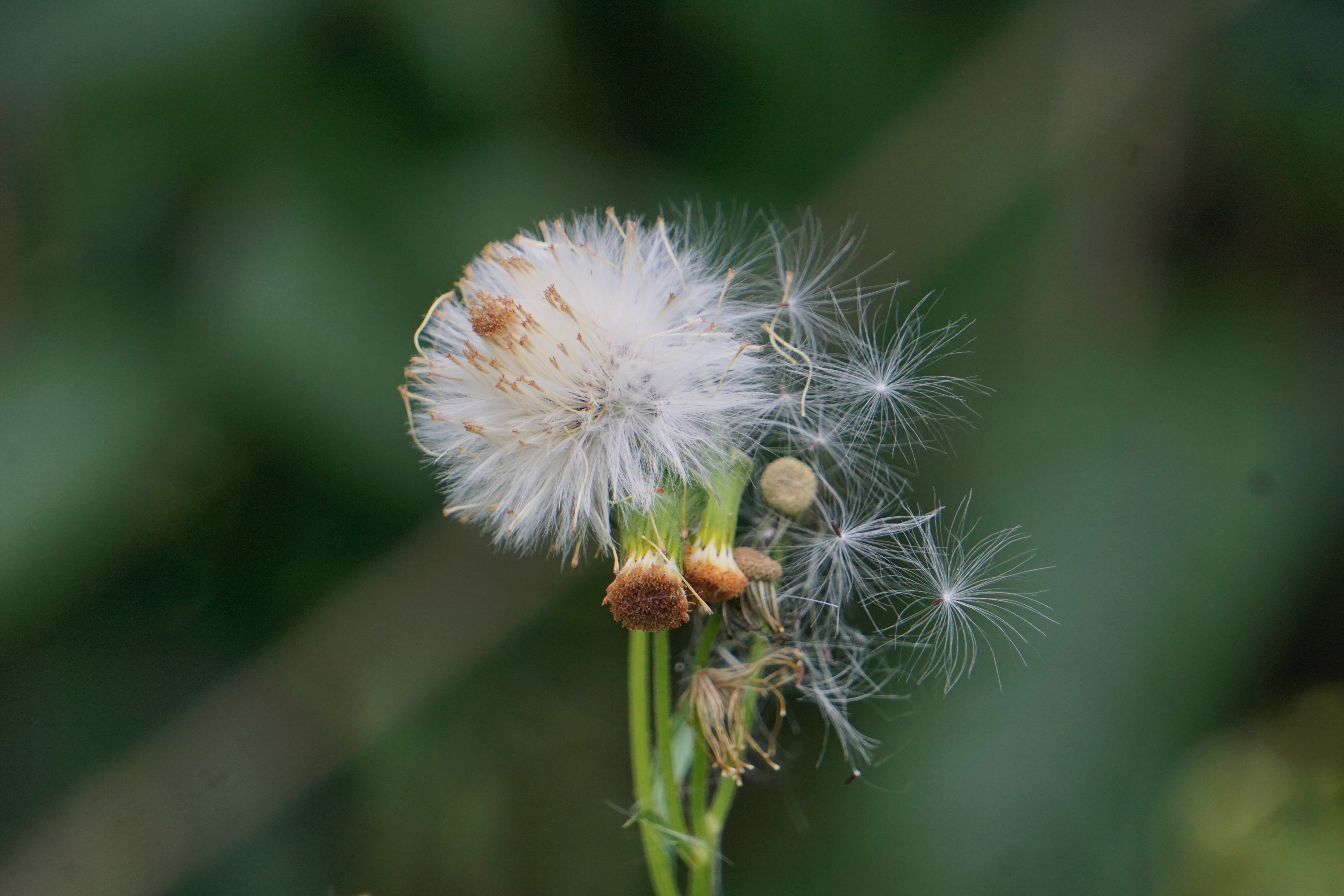 Alternative Text: Close-up of a dandelion seed head with delicate white seeds starting to disperse against a blurred green background.