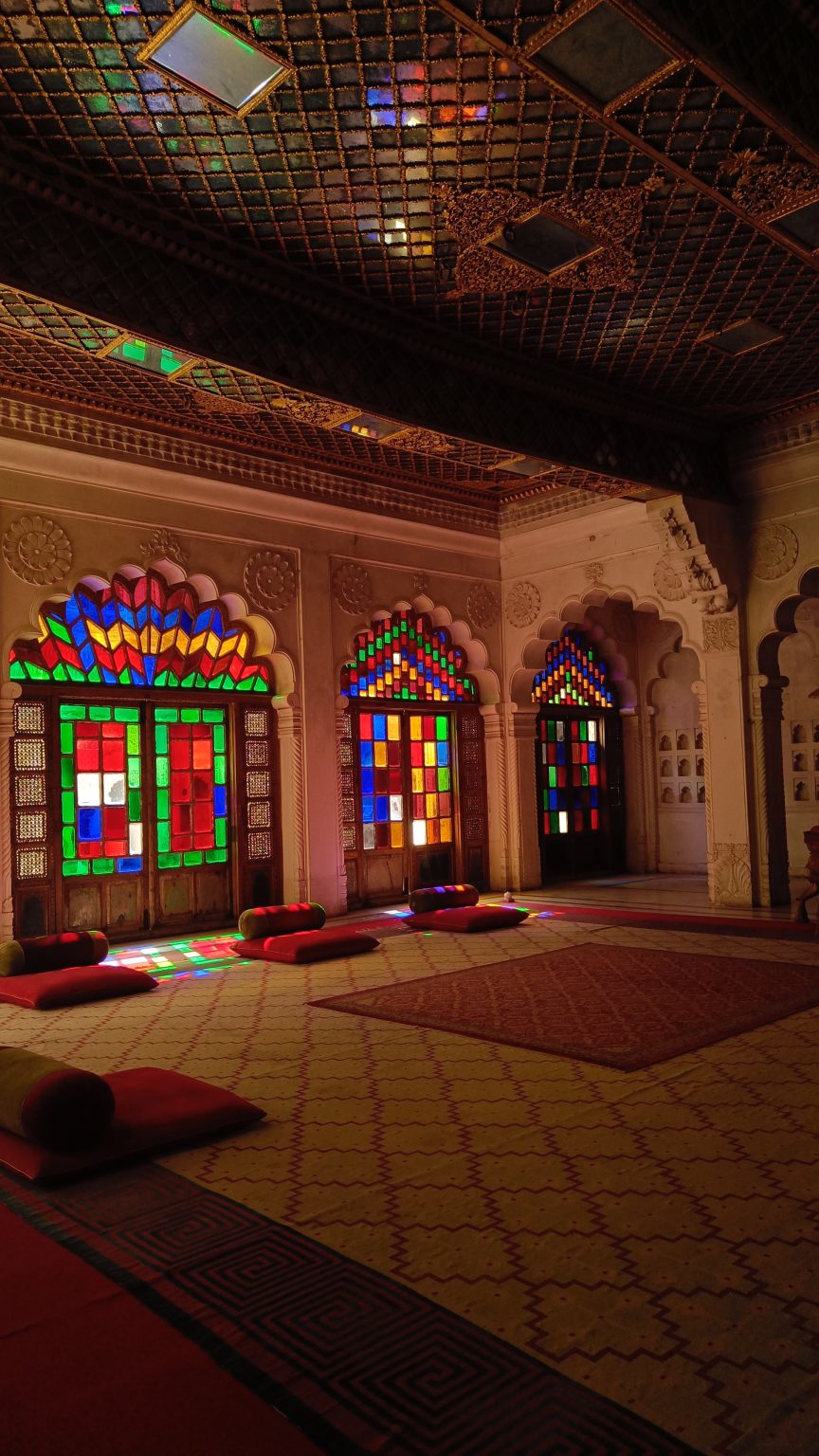 Alternative Text: A hall with a beautiful coloured tinted glass windows, carpet and cushions on the floor, and glasses on the roof reflecting the colors.