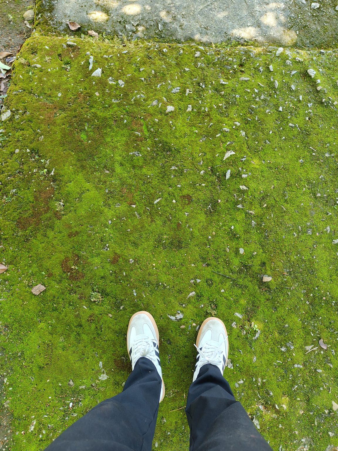 Alternative Text: A pair of white sneakers stands on a vibrant green moss-covered surface, surrounded by small stones and leaves.