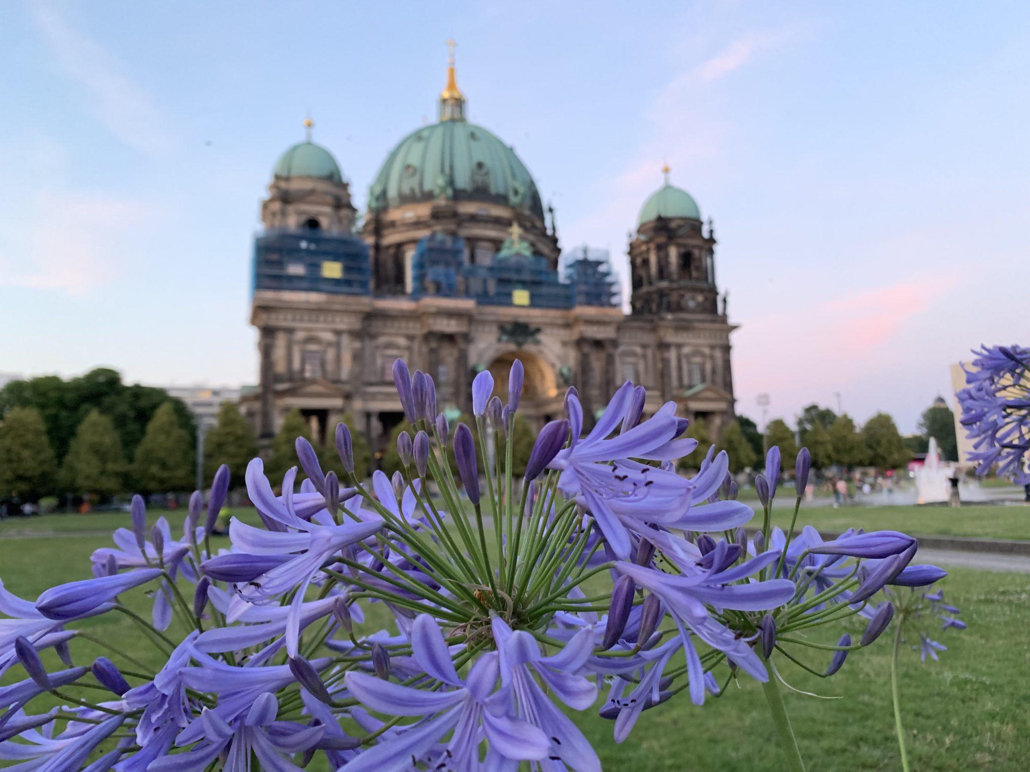 Alternative Text: Purple flowers in the Lustgarten in Berlin Germany with the Berlin Cathedral out of focus in the background.