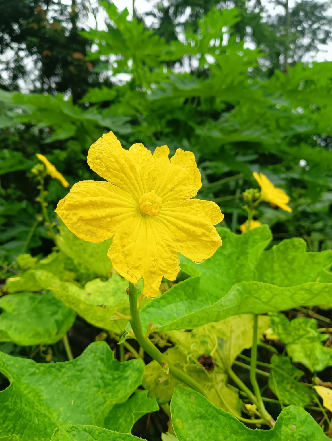 Alternative Text: A vibrant yellow flower with a textured surface blooms amid lush green leaves in a natural setting.