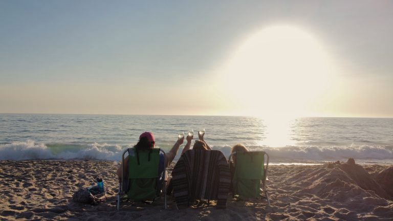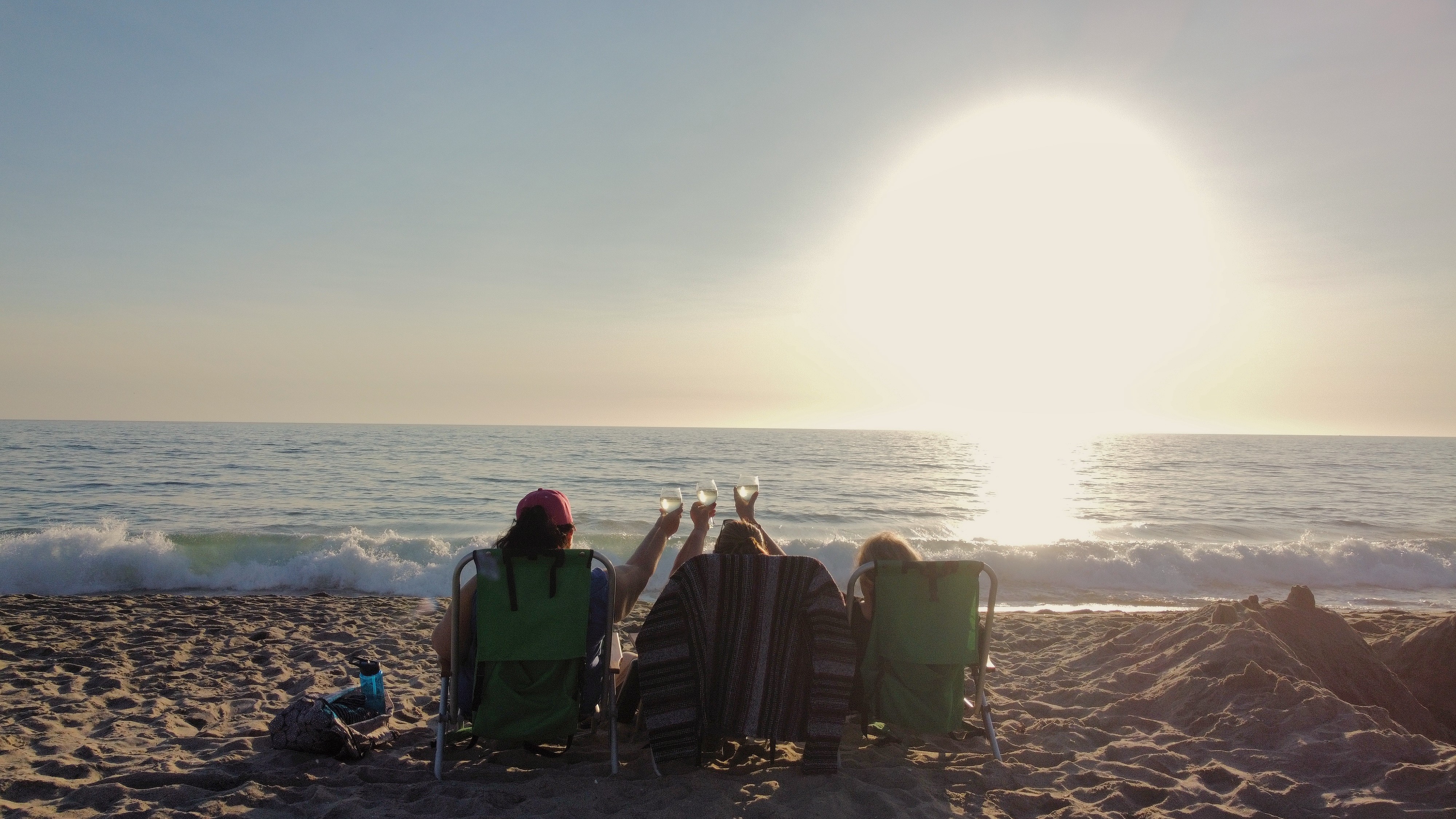 Alternative Text: 3 best friends sitting in chairs on a beach watching the sunset and raising a glass of wine to toast one another.