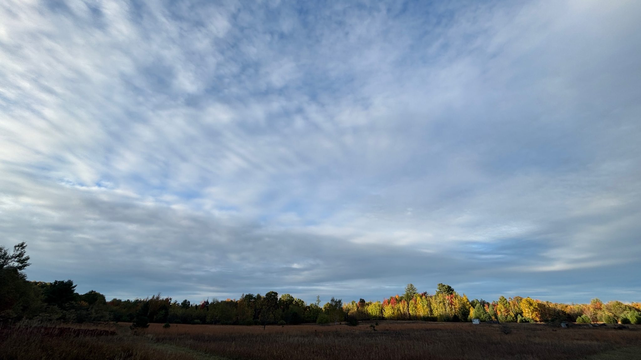Alternative Text: An open field. Most of the picture is the sky, mostly covered with cirrus clouds. At the bottom there are trees on the horizon in autumn colors, lit by the morning sun, contrasted with the field, which is in shadow
