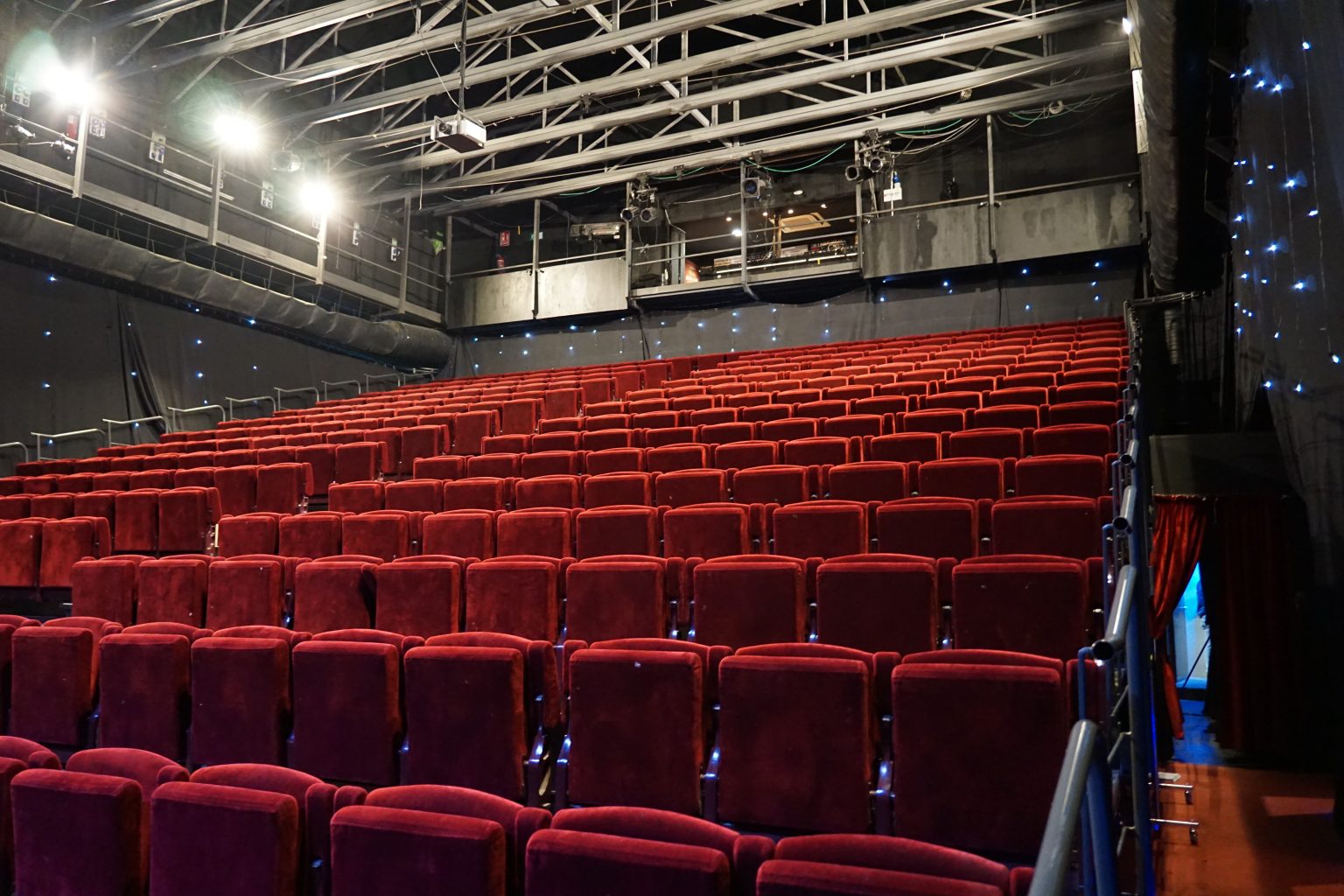 Alternative Text: An empty theater with rows of red seats and a partial view of the stage lighting and sound equipment from the back of the room. The walls are dark, with small, blue lights scattered on the sides.