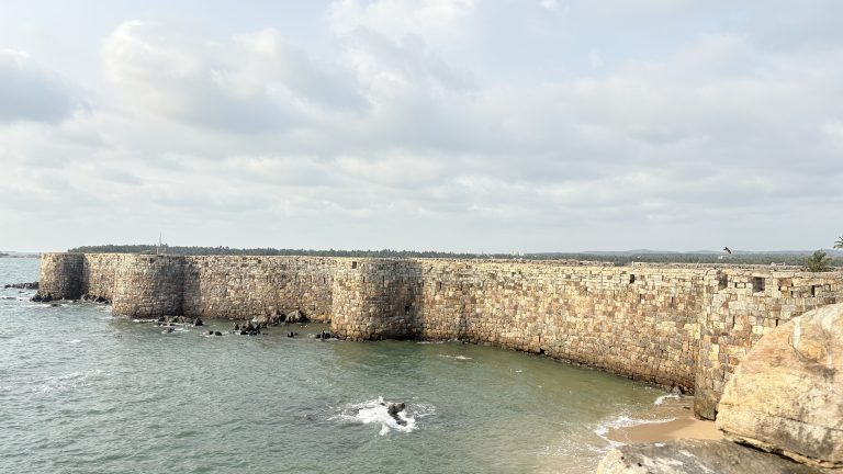 Alternative Text: A long, curved stone wall stretches along the coastline, partially submerged in the shallow water. The wall features large, weathered stones and has several openings.